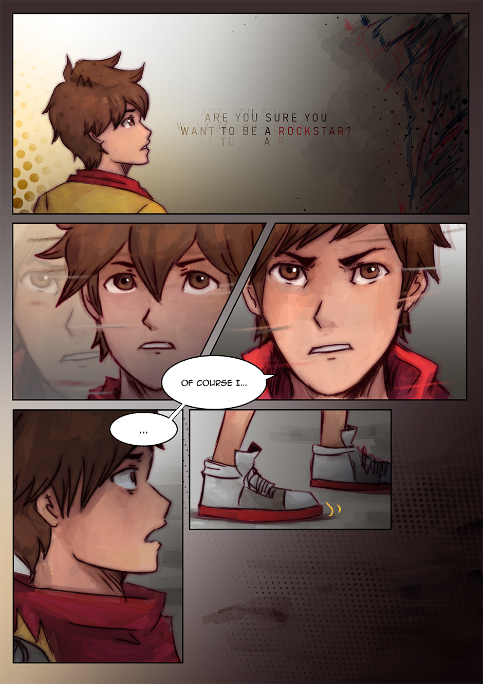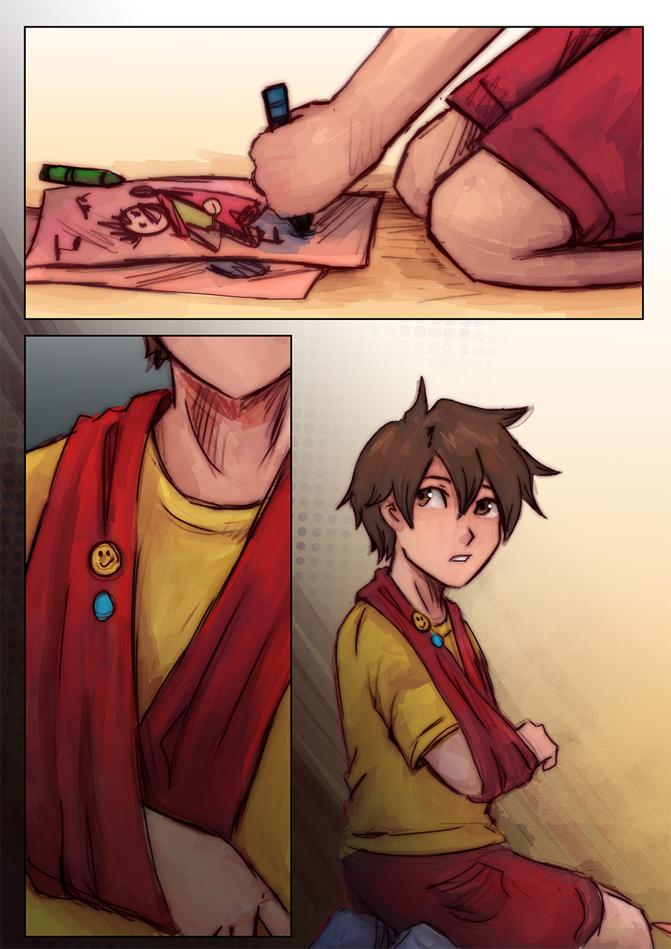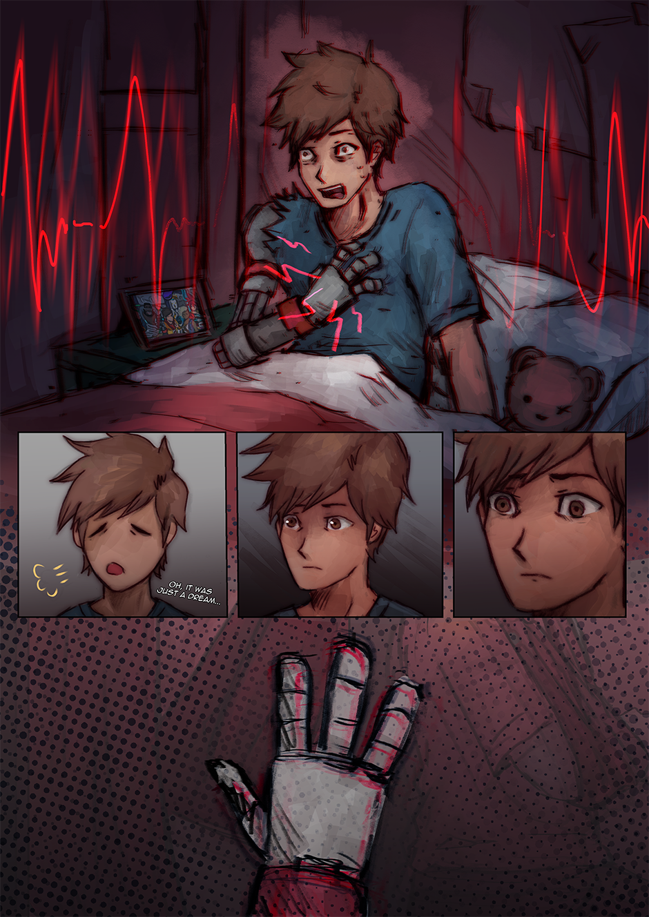 Part of the pages here were part of a short four-page mini comic that I had made a long while ago called 'Bad Dreams'. I didn't feel like posting it at the time because I felt as though it was missing something. But after I started Firmware Update, I repurposed these pages to help convey the emotions Chai is feeling at this moment. The young Chai is based on some old sketches of young Chai I did a while back and on the interpretation that Chai has been disabled since he was born. Also, originally, CNMN was going to be part of that dream sequence, but I felt that the scene might a bit too silly, so I replaced him with Roxanne xD