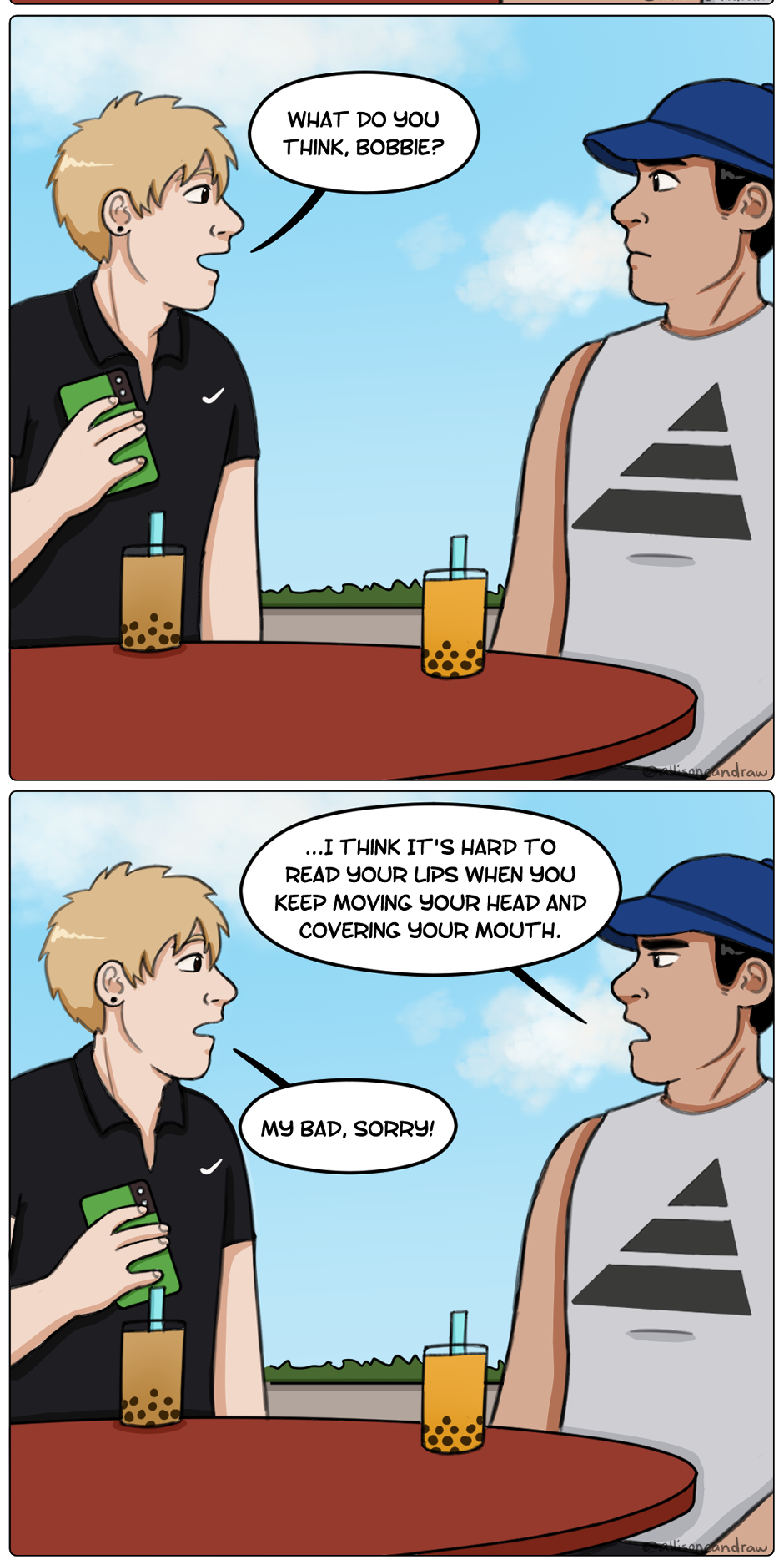 Bobbie's good at lipreading. But he needs to actually see your lips to do it. Check out my Patreon for early access to comics, WIPs, and more! https://www.patreon.com/allisoncandraw My links/socials: https://linktr.ee/allisoncandraw
