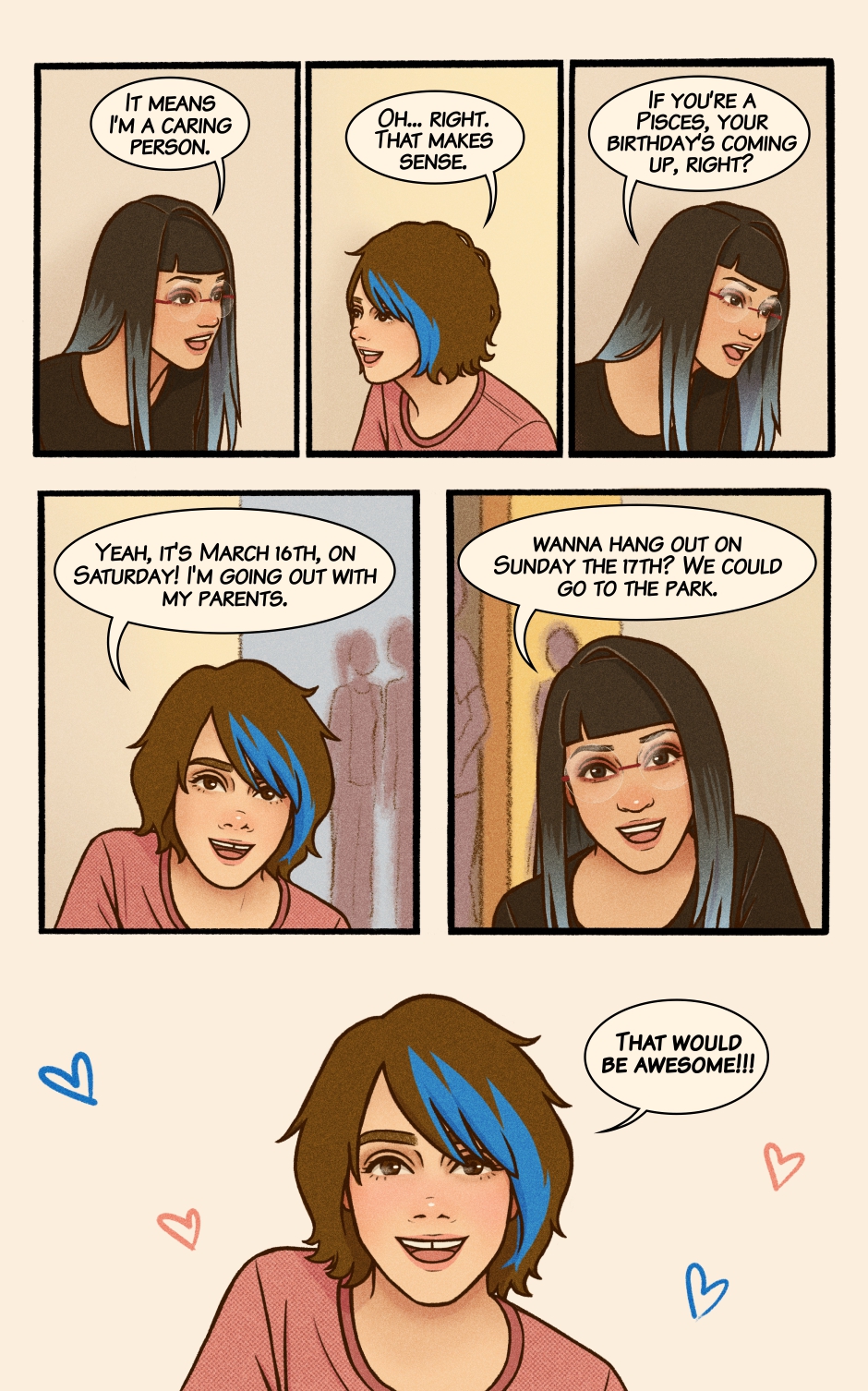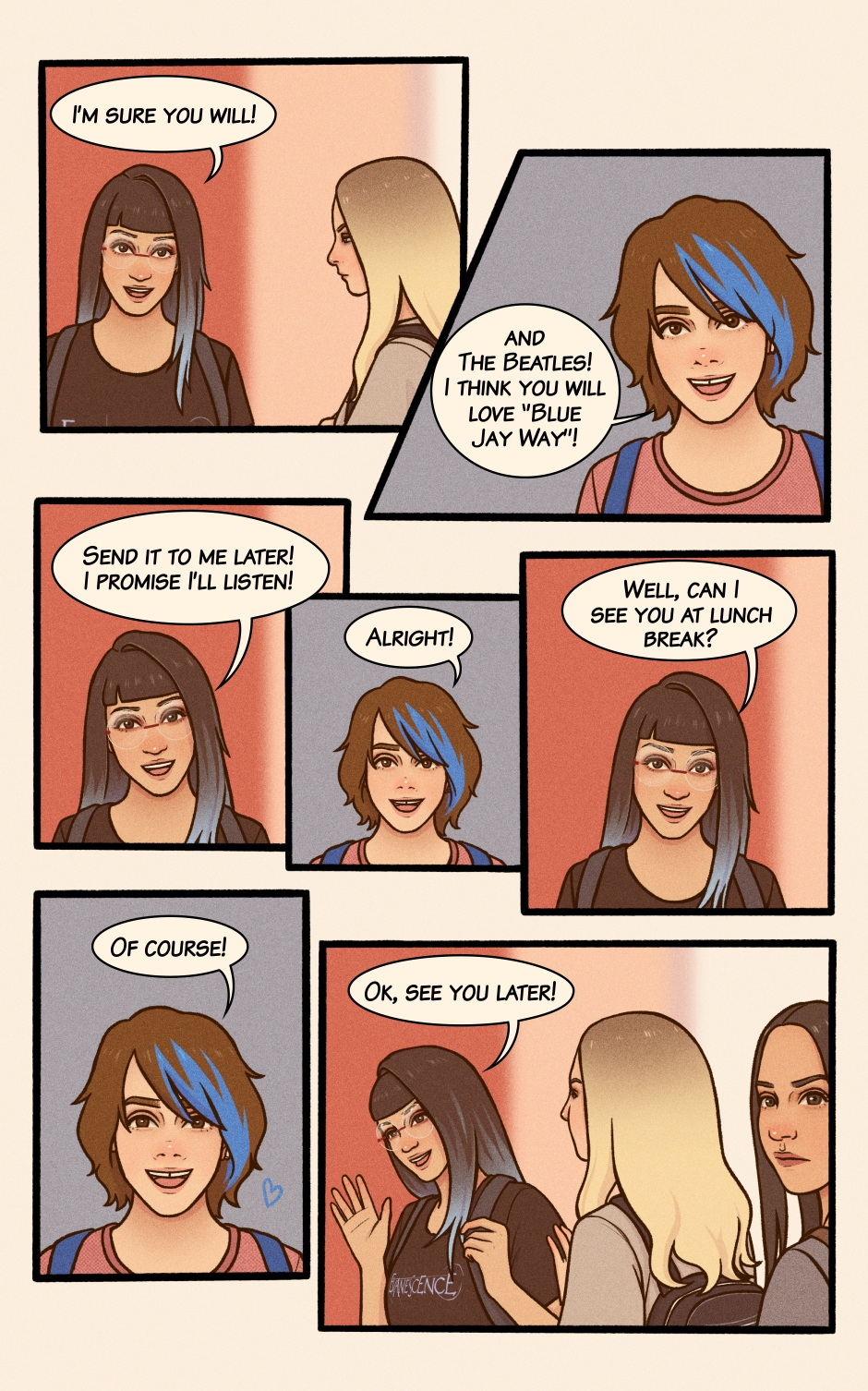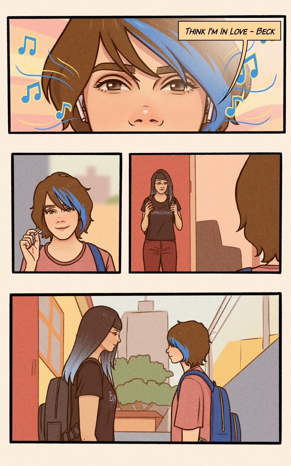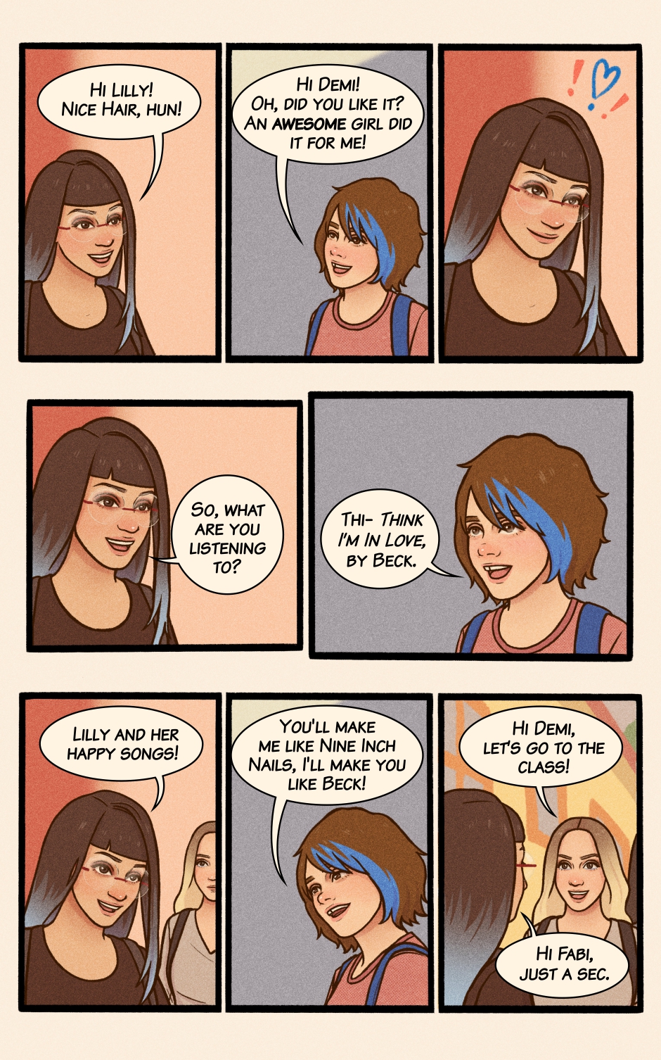 Lilly’s a fun and Lighthearted teen, living life to the beat of her favorite songs, filled with silly mishaps, cats, and joy. But when a girl with blue hair comes into the picture, her world suddenly bursts with new colors—and Lilly knows she has to find a way to get closer to her.