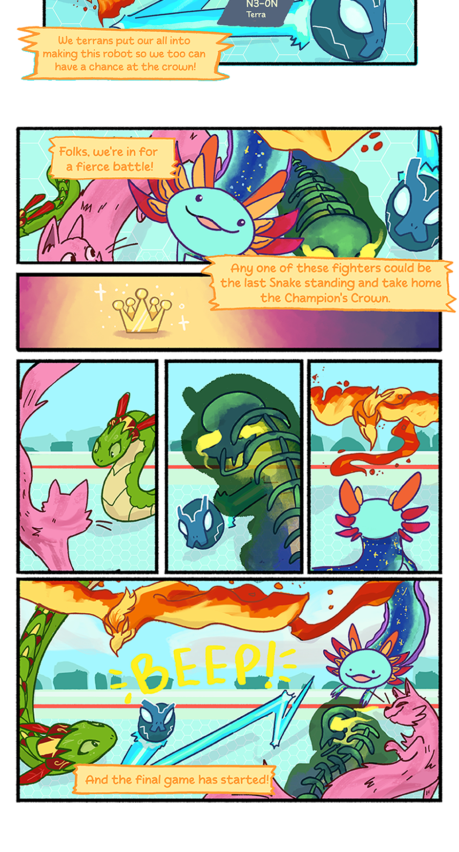 A young Snake excitedly watches the final match of the Terran Snake Games. A diverse assortment of Snakes from all the biomes compete to become champion. Who will come on top?