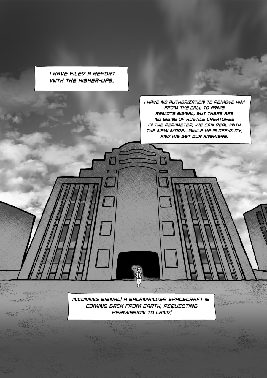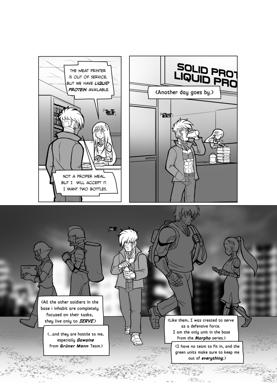 Crisanto is a cyborg soldier created to defend a newly stablished off-world colony. However, more than battles he yearns of companionship, concept that in his world is not embraced. Then he meets Brant, a cyborg who has just arrived from a scouting mission on Earth, and recently got transferred to the same base he is in. They get to know each other and their relationship develops.