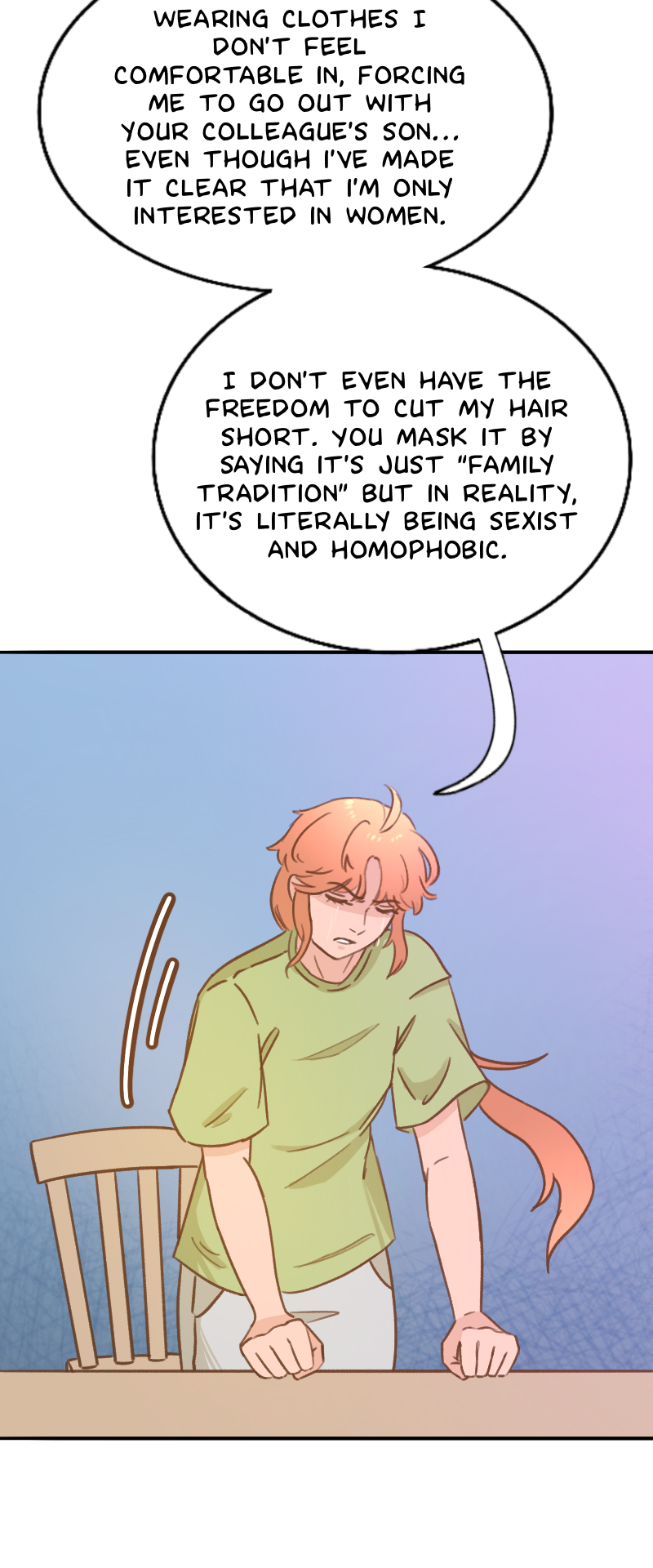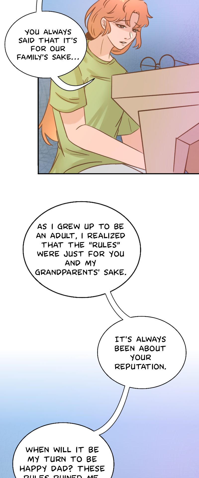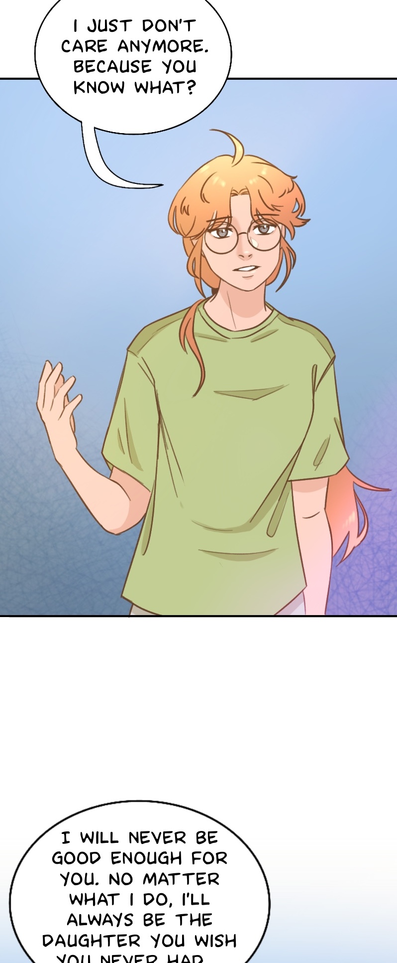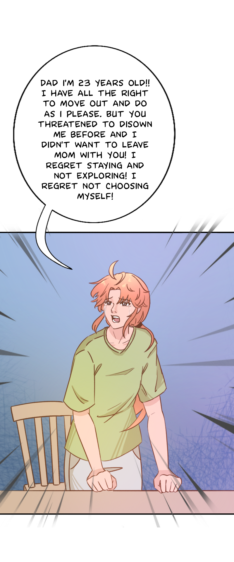 Yeeees! Finally i get to see a person who stands up to their crappy parent early on in a comic. Saying that thats difficult is an understatement but its really refreshing to see the very few that actually do it! Very cool😊