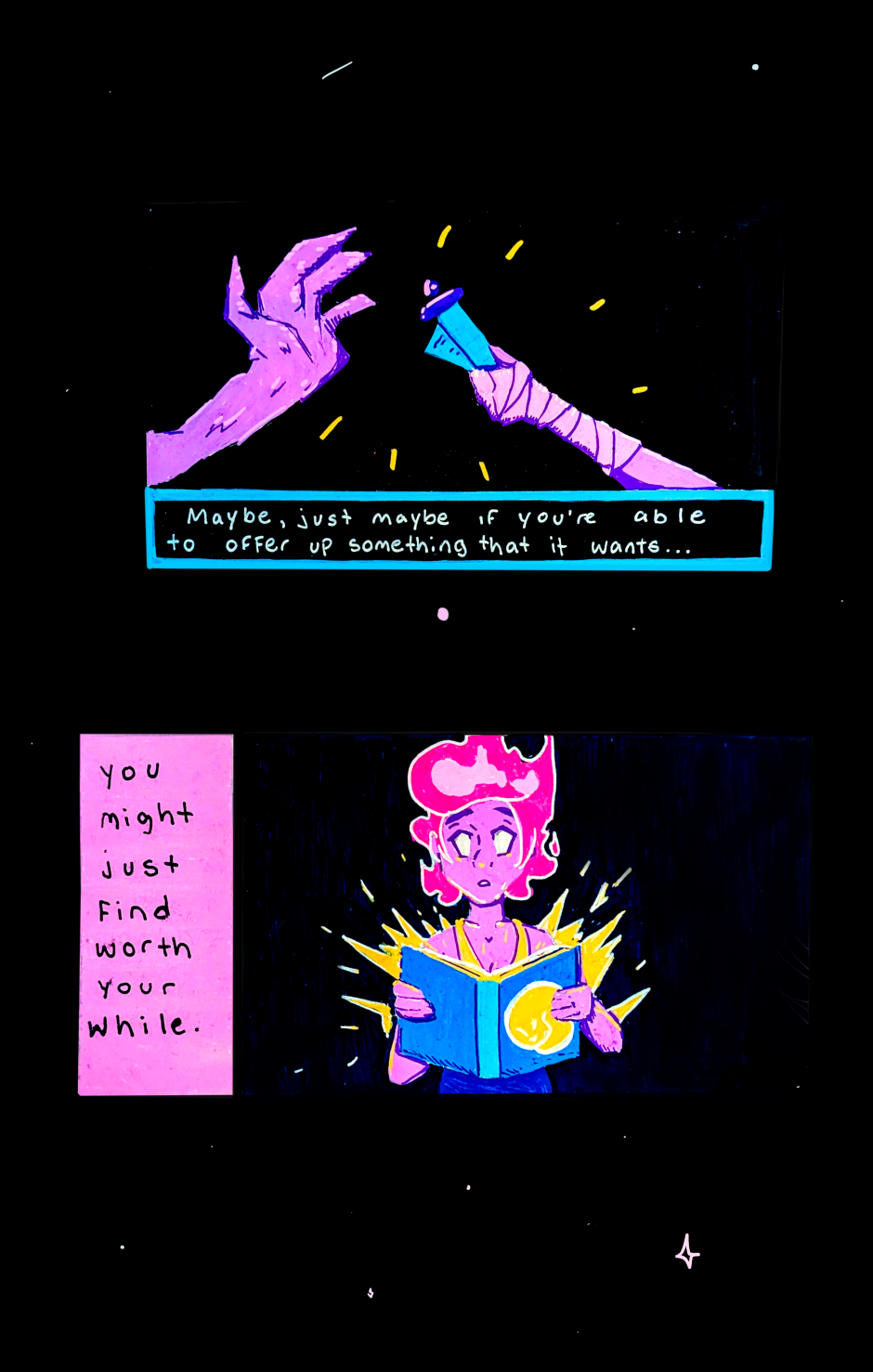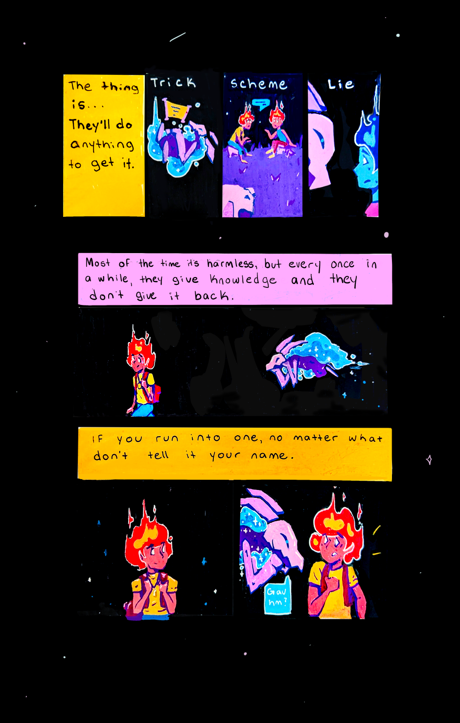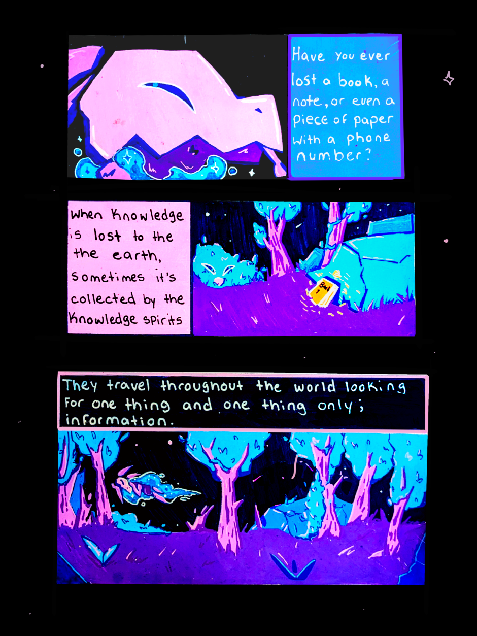 A series about the start of a distinct world that lives in nightfall. Light has become the greatest resource and the inhabitants in this world have learned to adapt. Enjoy panels of vibrant, dreamy illustrations as you embark into this new land. Despite the darkness, things always manage to glow a little brighter here.