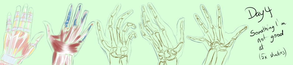 Day 4 - Draw a part of the human anatomy you have trouble with. x20, with at least 5 being skeletal/musculature studies. Oh god, this one was pretty hard to do. Also I did study part asap because it is 2 am and I have to get up early tomorrow.