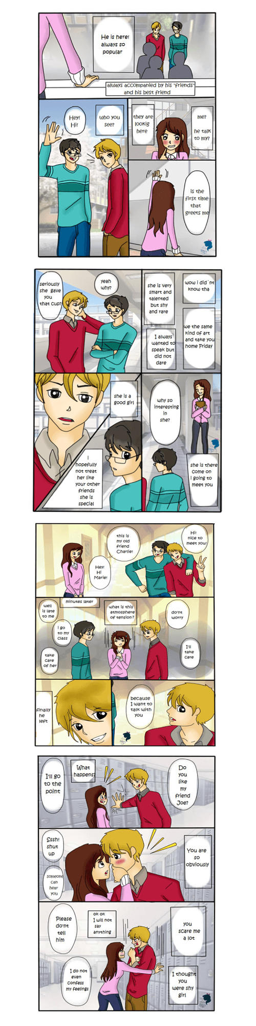 This is a small love story full of humor that tells how Marie met Joe. all begins when Marie decides to give a gift on Valentine Day to Joe. she is secretly in love and decides to show feelings for him . Gradually the destination is responsible for bringing them together in the same classroom and hallways , where she with her eccentricities , oddities and peculiar way of approaching him with strange excuses you are looking to conquer and win her heart
