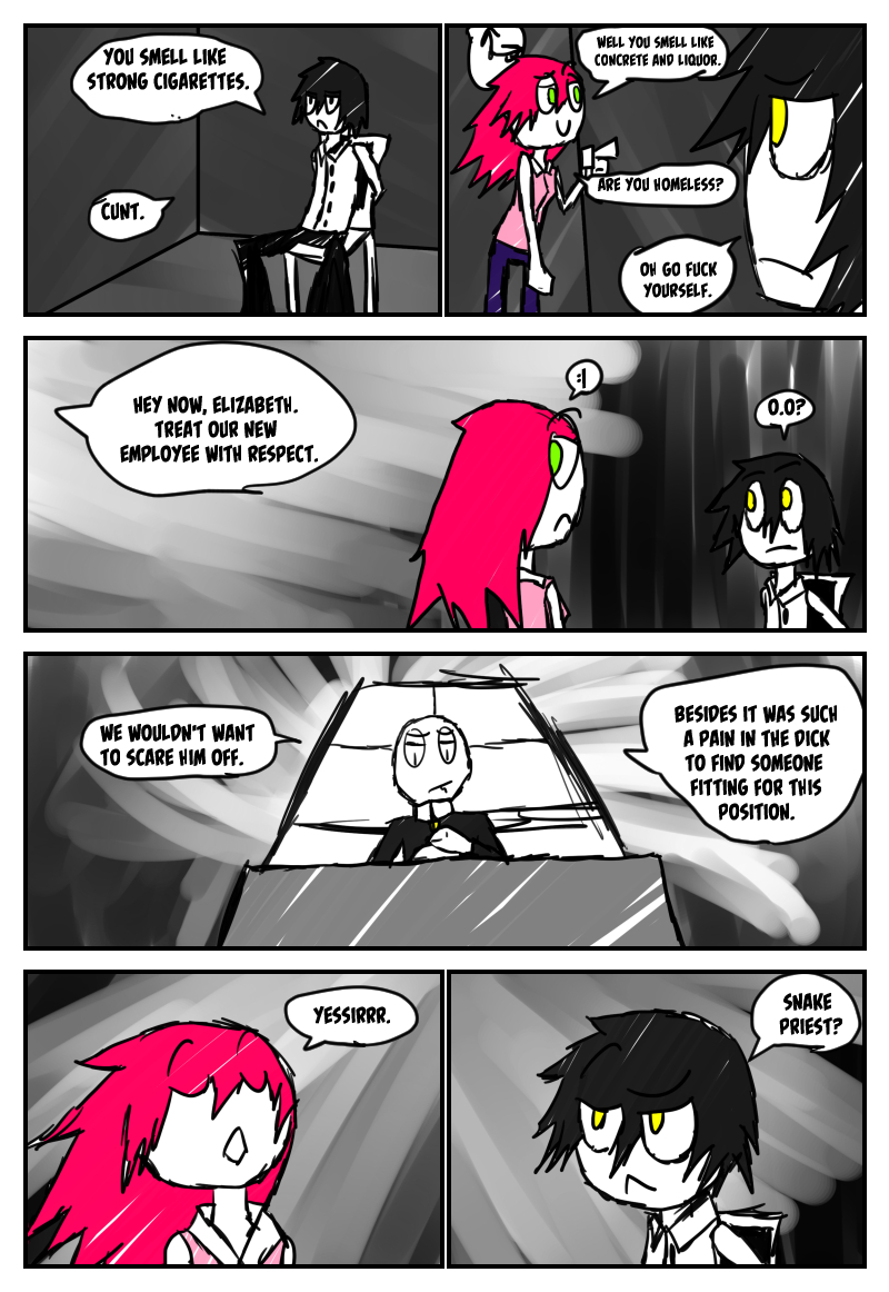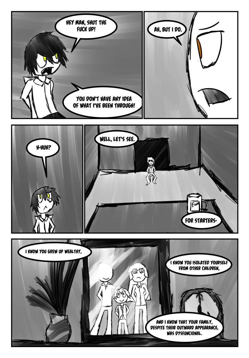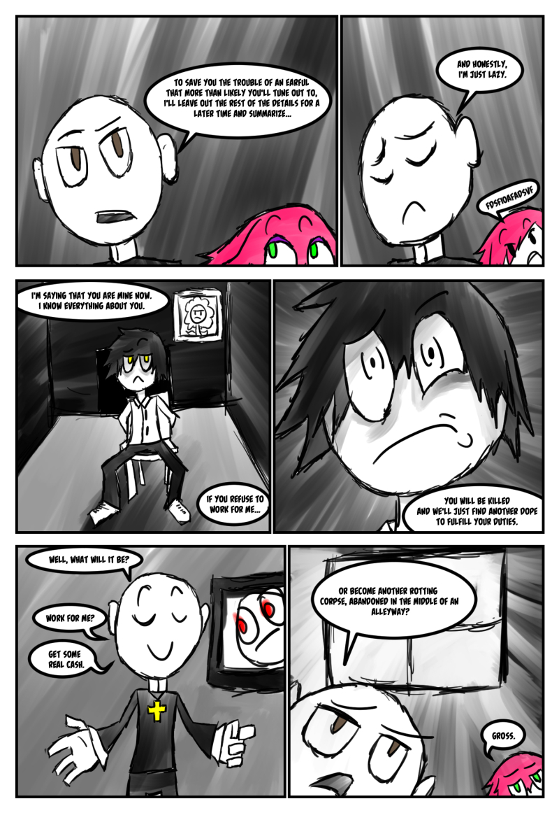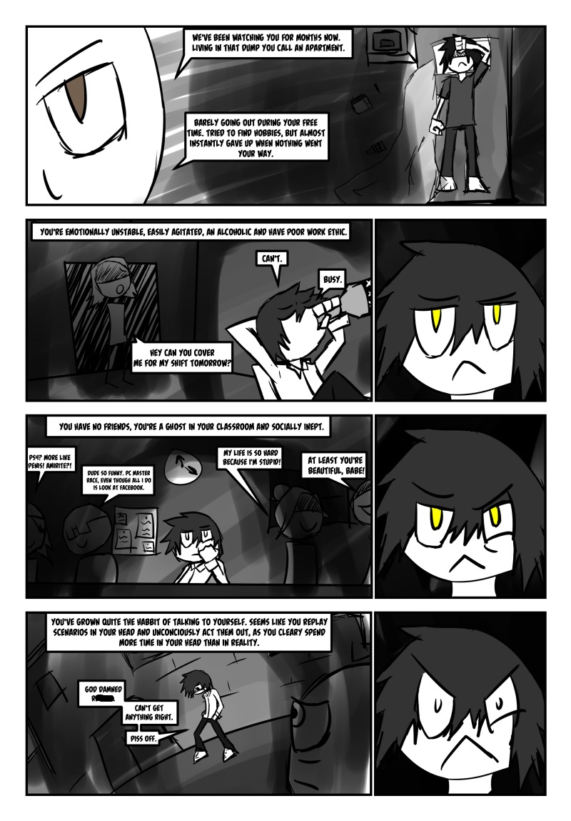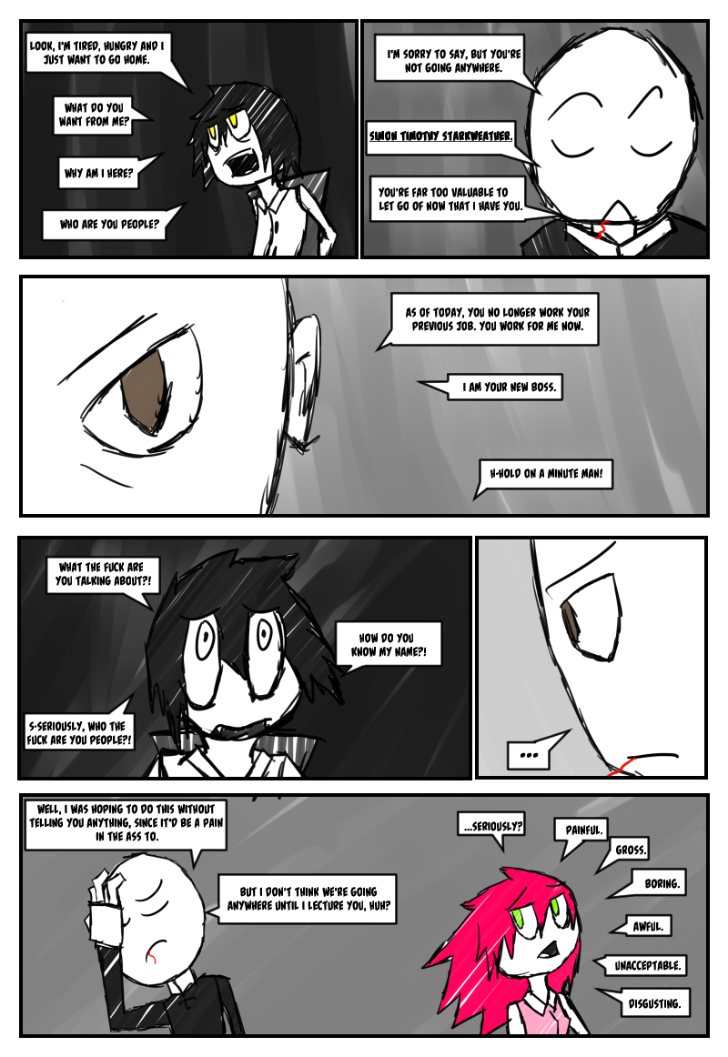 Follow Simon as he stumbles awkwardly through his new life, balancing a new, on call hitman job and college. A split personality, that's appeared before Simon but not too often, is now more seemingly more prevalent as he appears when Simon is most vulnerable. Stress begins to pile onto Simon's shoulders as the story progresses, with each new chapter a further descent into madness and anger.