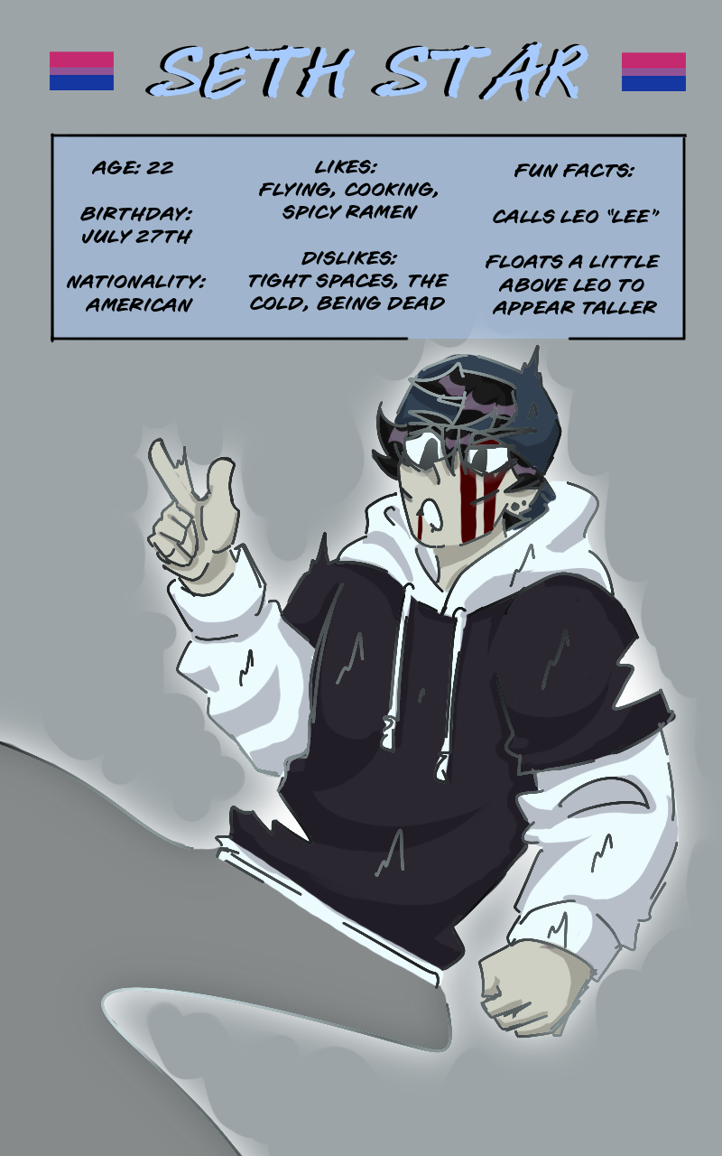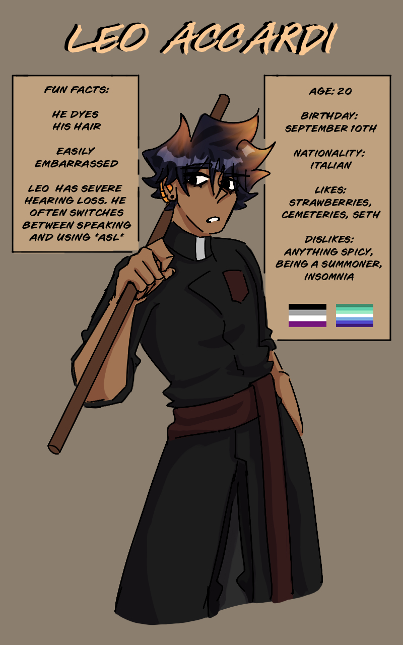 Hello!! Episode 3 is going to be late - I was sick for a while and wasn't able to work on it so instead I offer these character sheets of Leo and Seth :) Hope you enjoy!