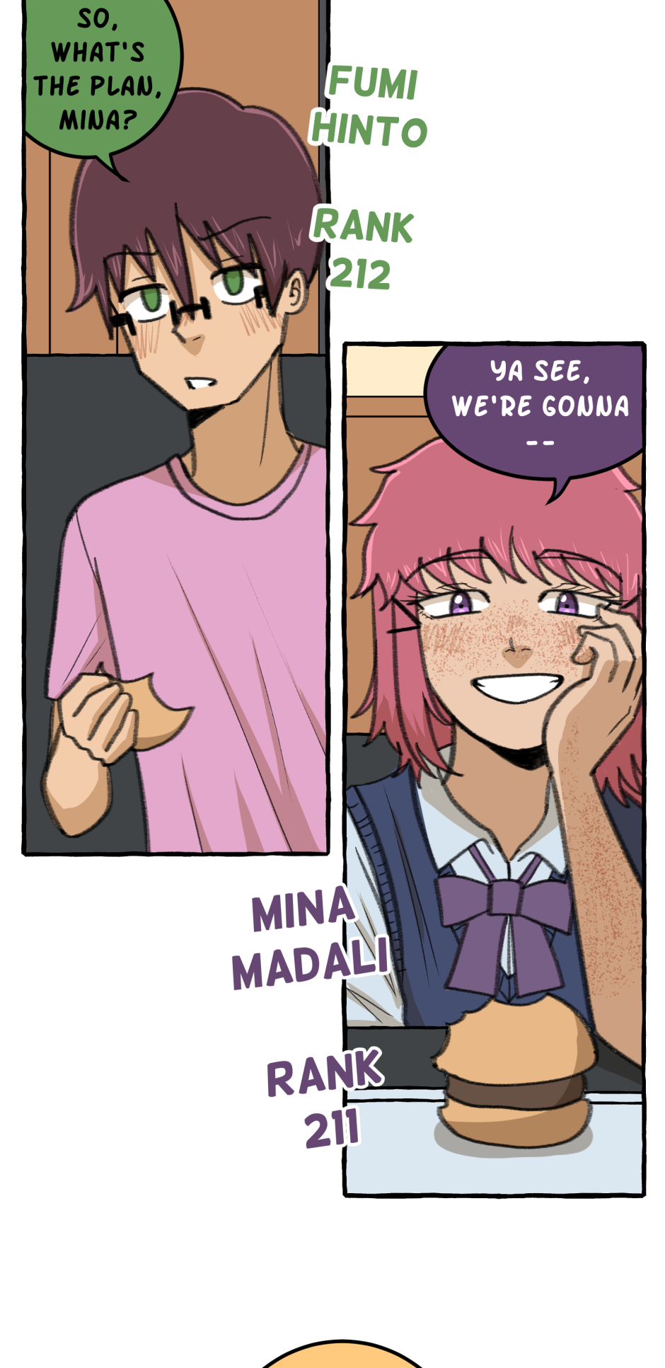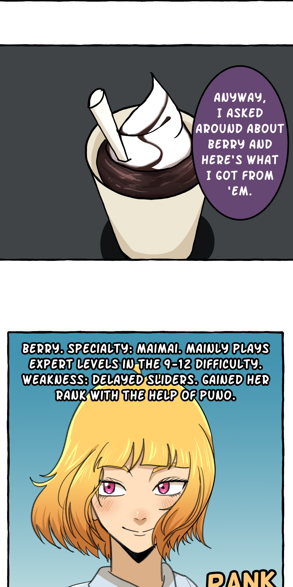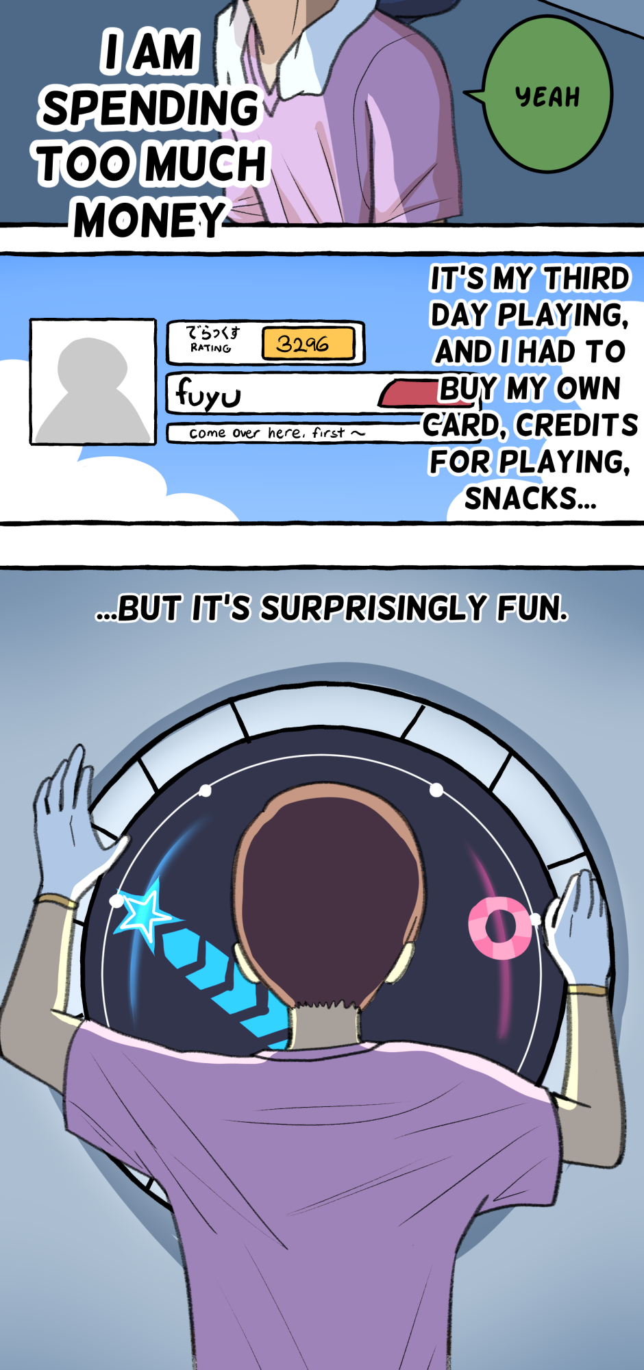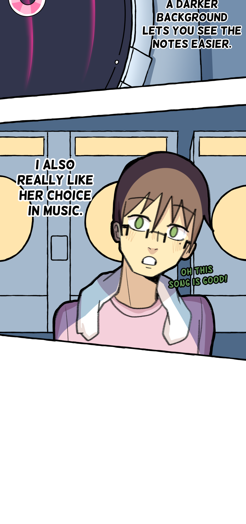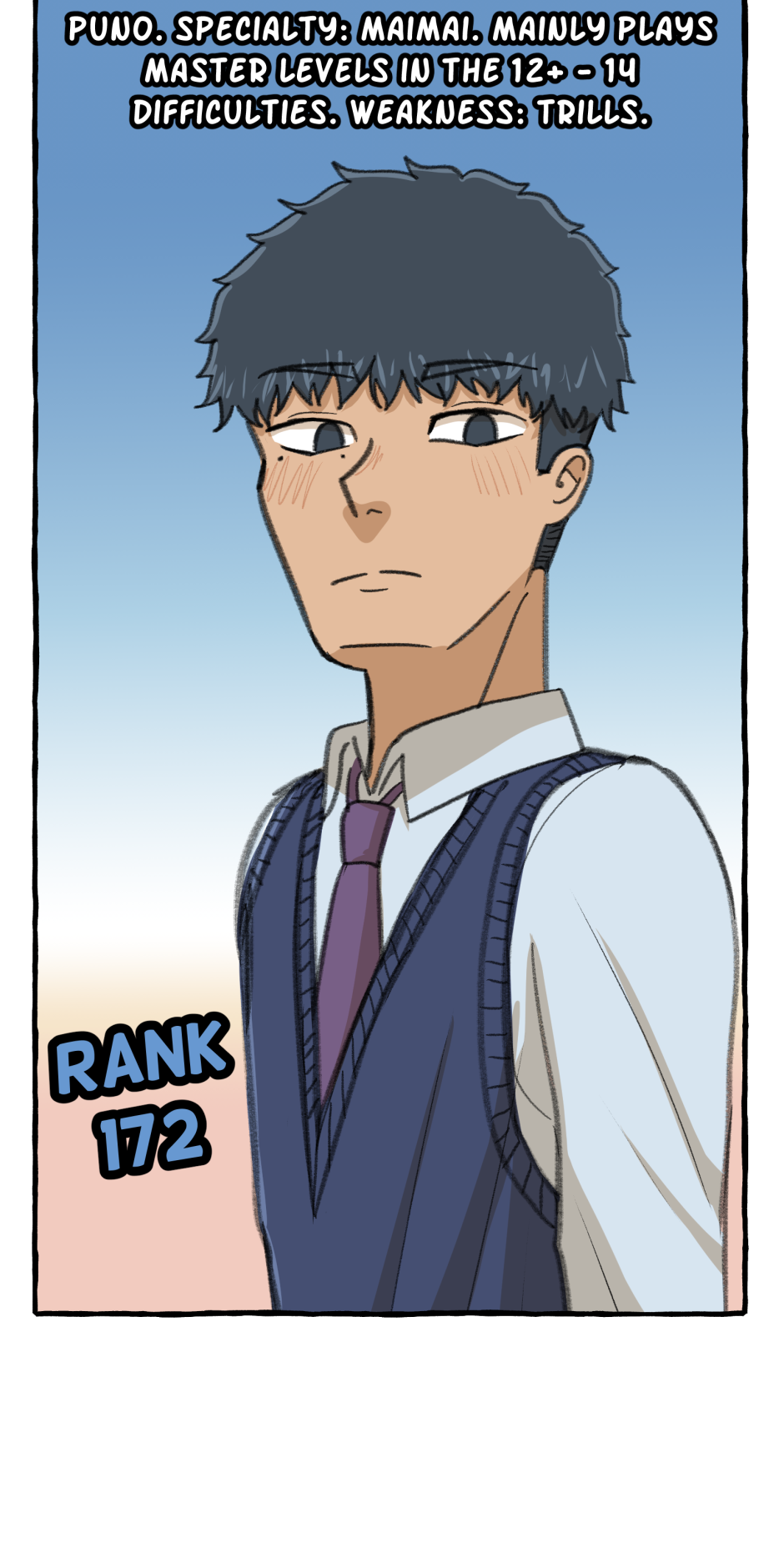 Fumi's school has a hierarchy based on their skill at rhythm games. However, he sucks at rhythm games, and is barely hanging on in the school rankings! A transfer student comes and declares that she'll take over the school and get rid of the ranking system! She wants him to climb to the top with her, but will he be able to catch up? Updates biweekly on Tuesdays, at least until I explode!