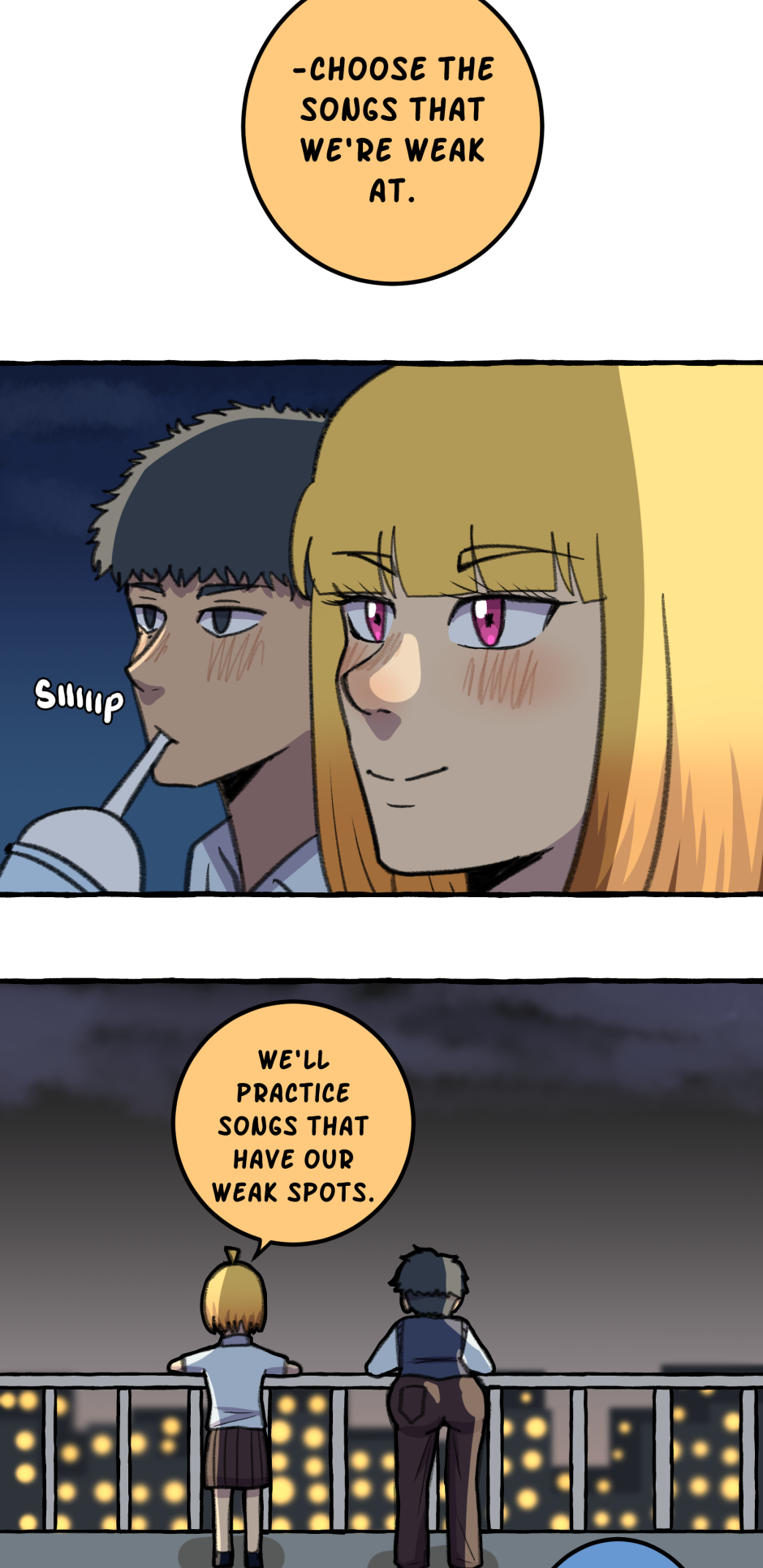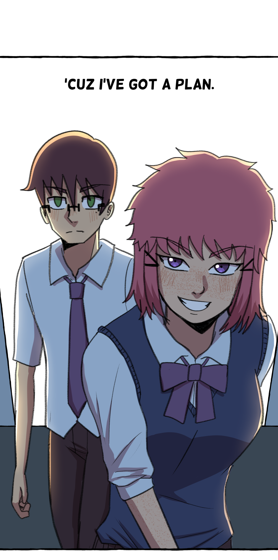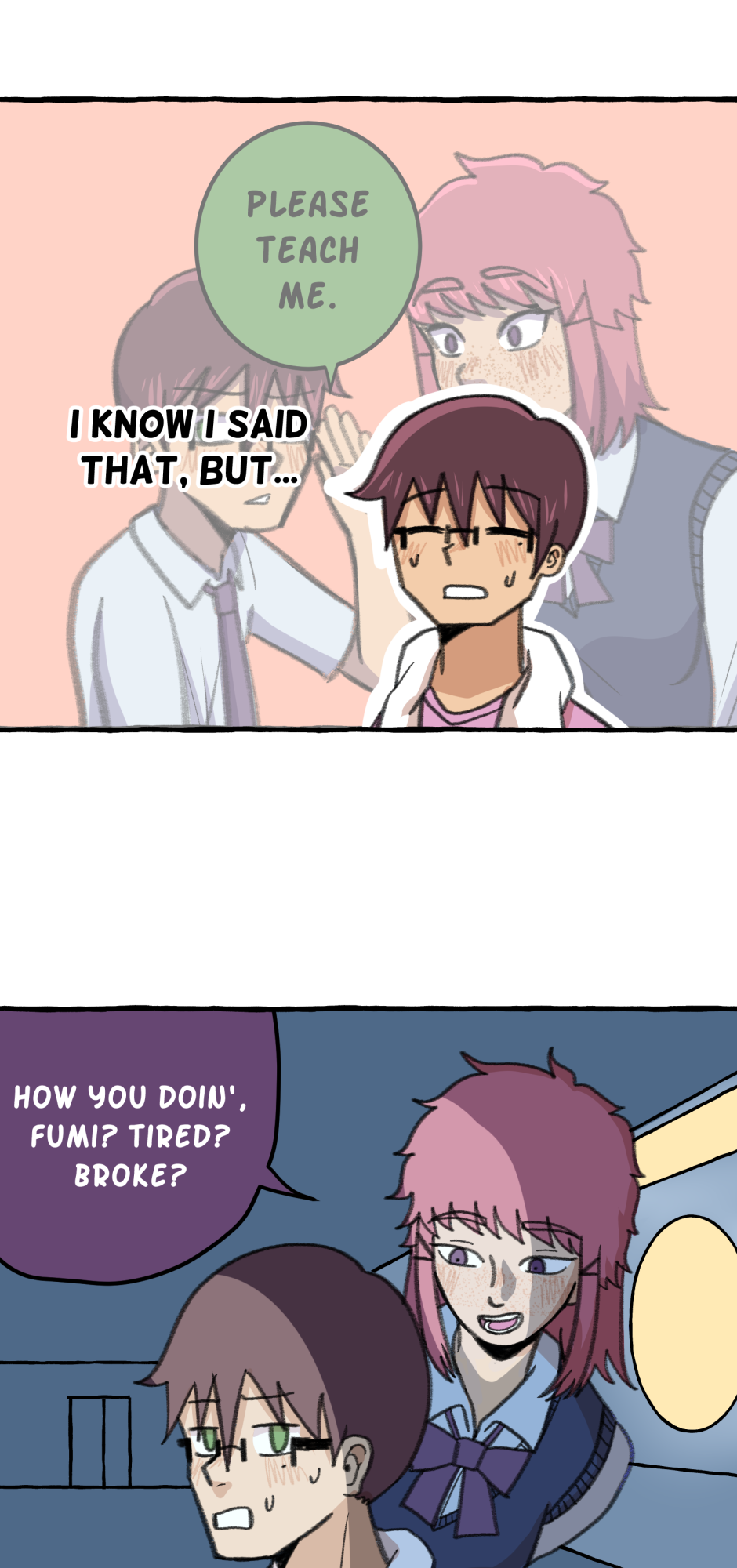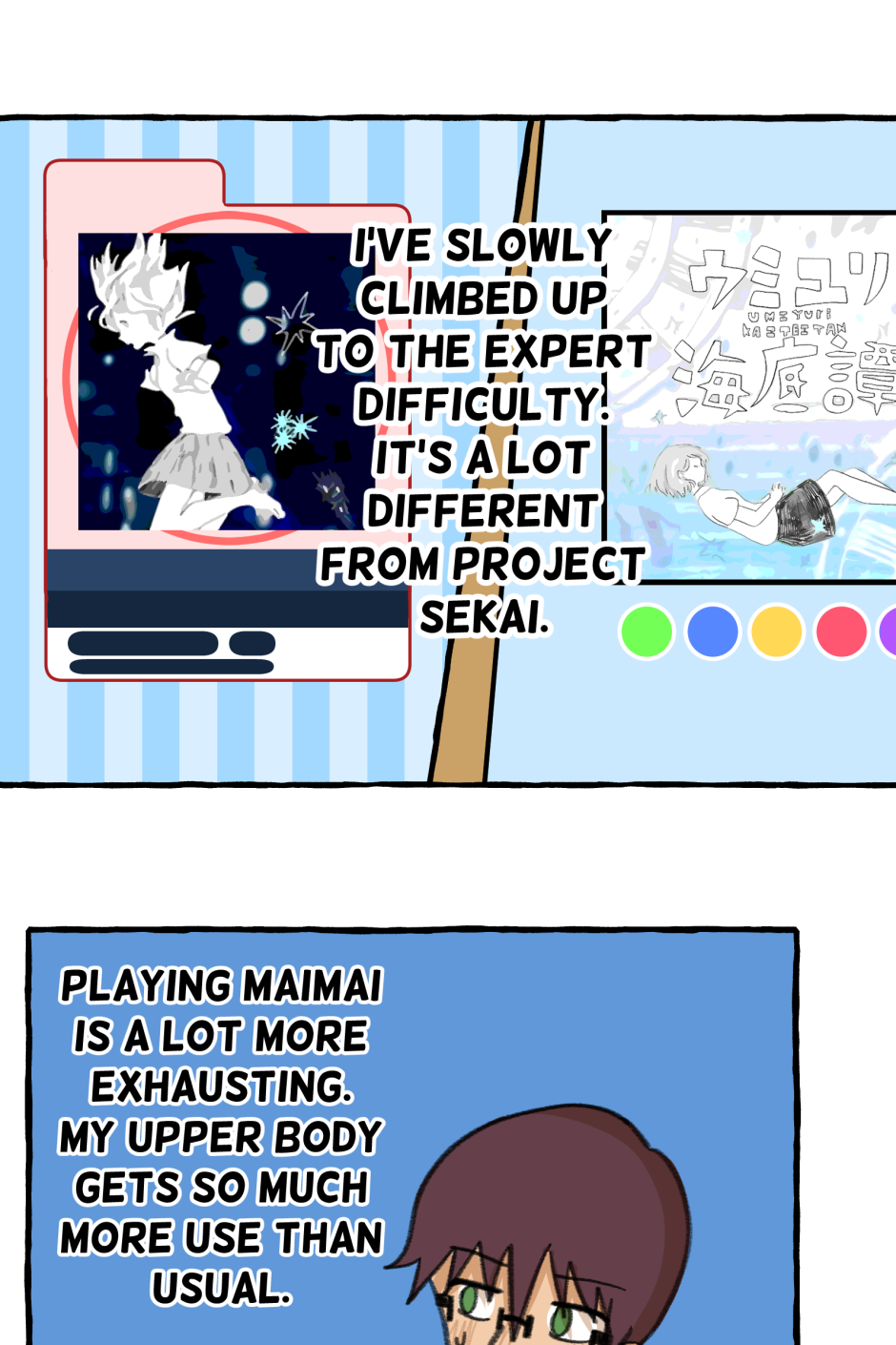 Fumi's school has a hierarchy based on their skill at rhythm games. However, he sucks at rhythm games, and is barely hanging on in the school rankings! A transfer student comes and declares that she'll take over the school and get rid of the ranking system! She wants him to climb to the top with her, but will he be able to catch up? Updates biweekly on Tuesdays, at least until I explode!