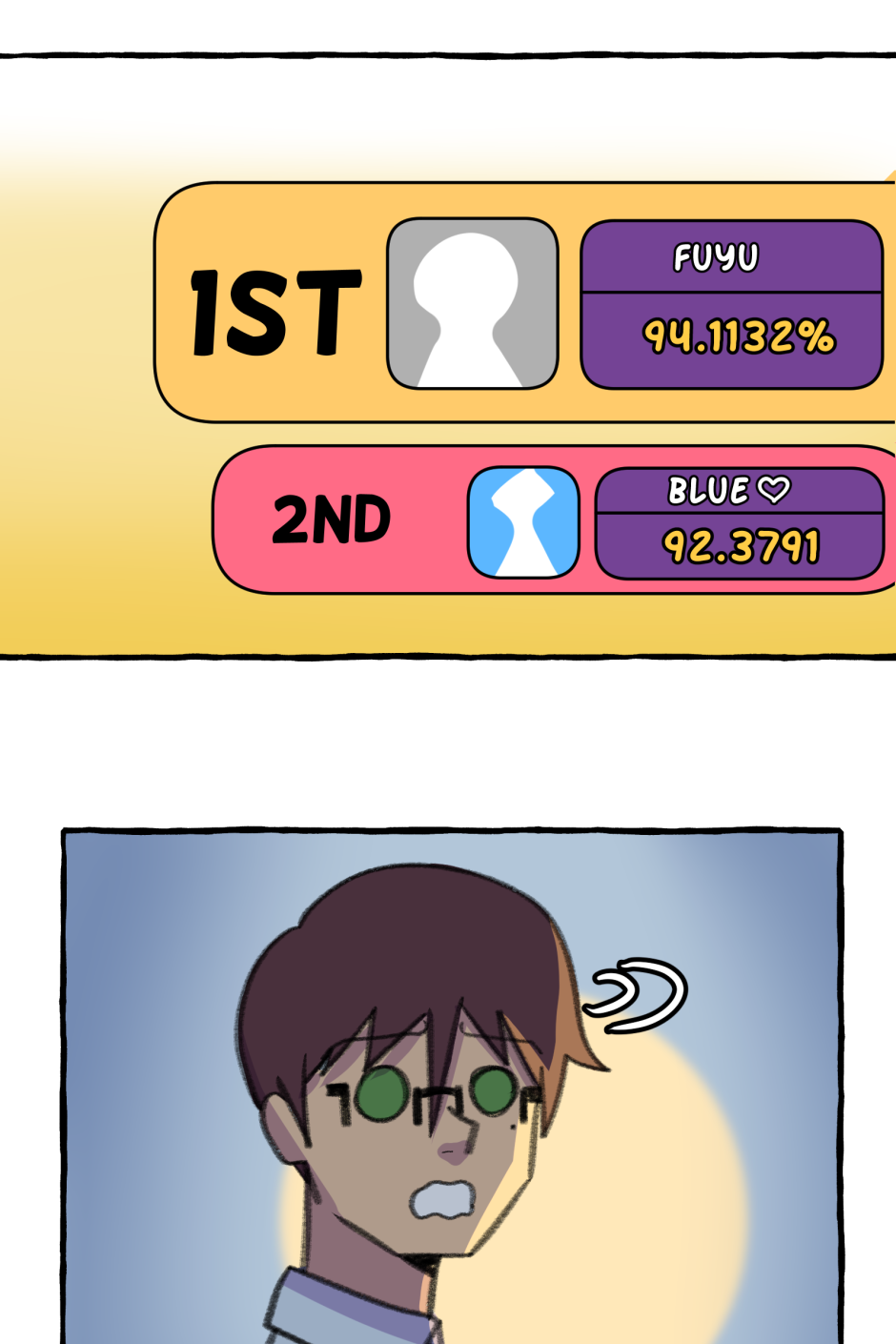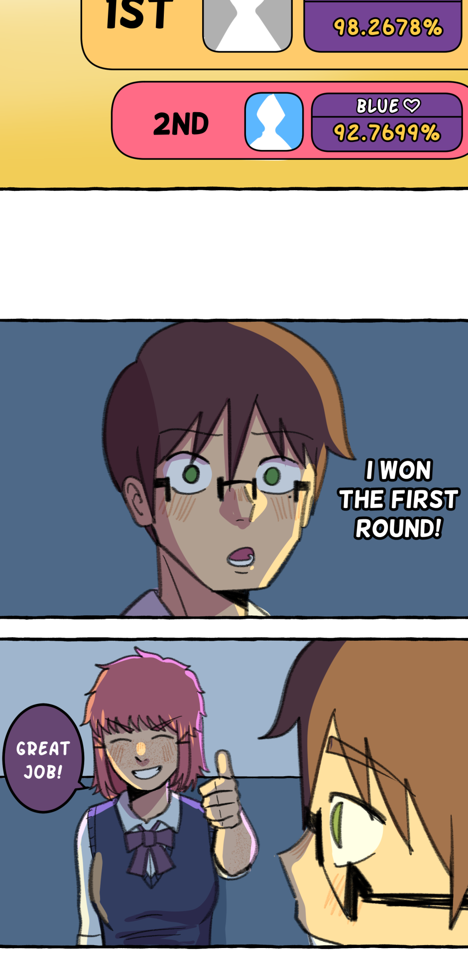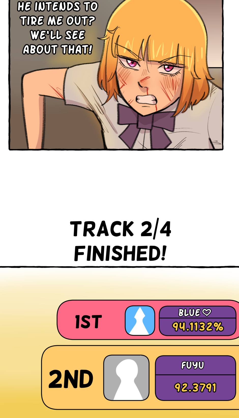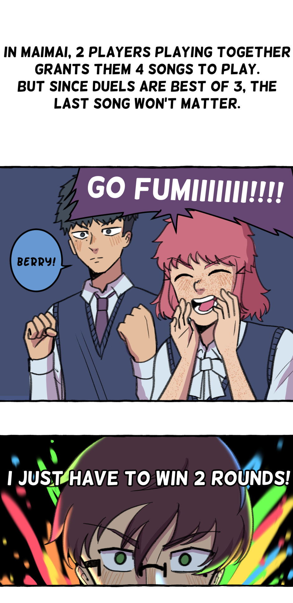 Fumi's school has a hierarchy based on their skill at rhythm games. However, he sucks at rhythm games, and is barely hanging on in the school rankings! A transfer student comes and declares that she'll take over the school and get rid of the ranking system! She wants him to climb to the top with her, but will he be able to catch up? Updates biweekly on Tuesdays, at least until I explode!