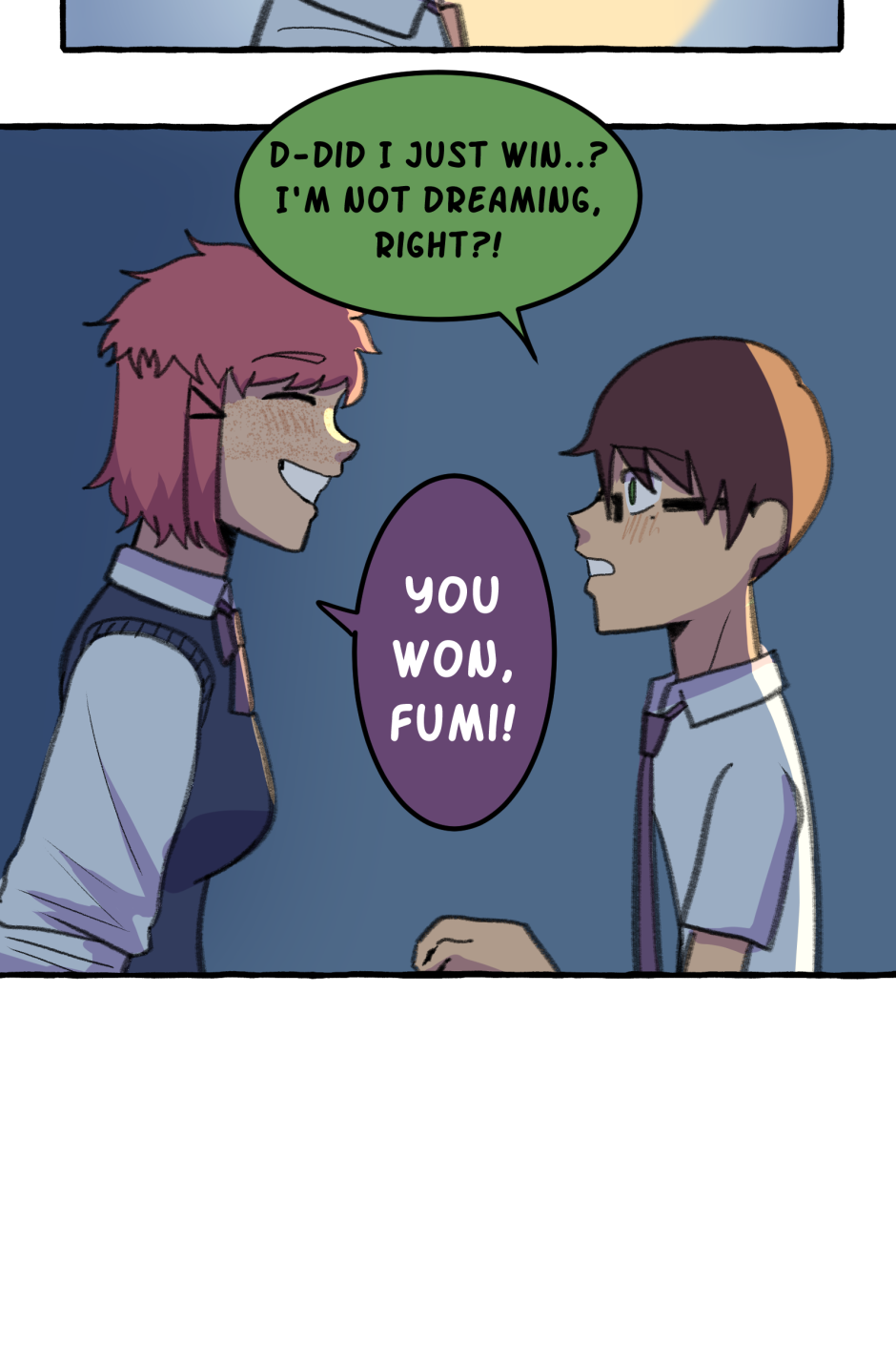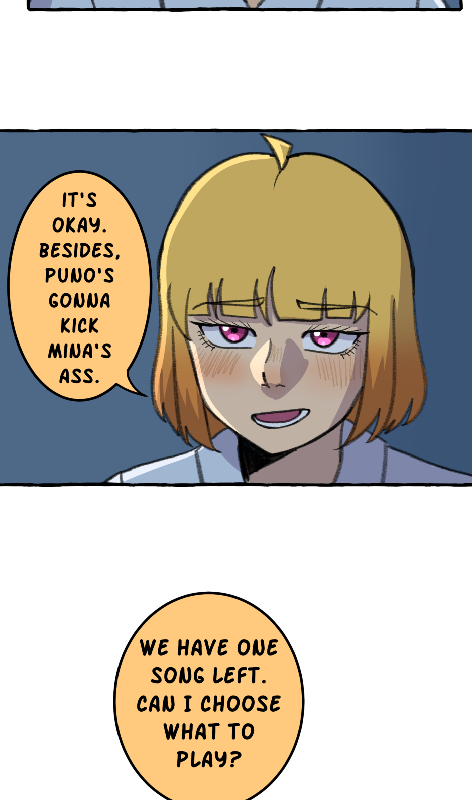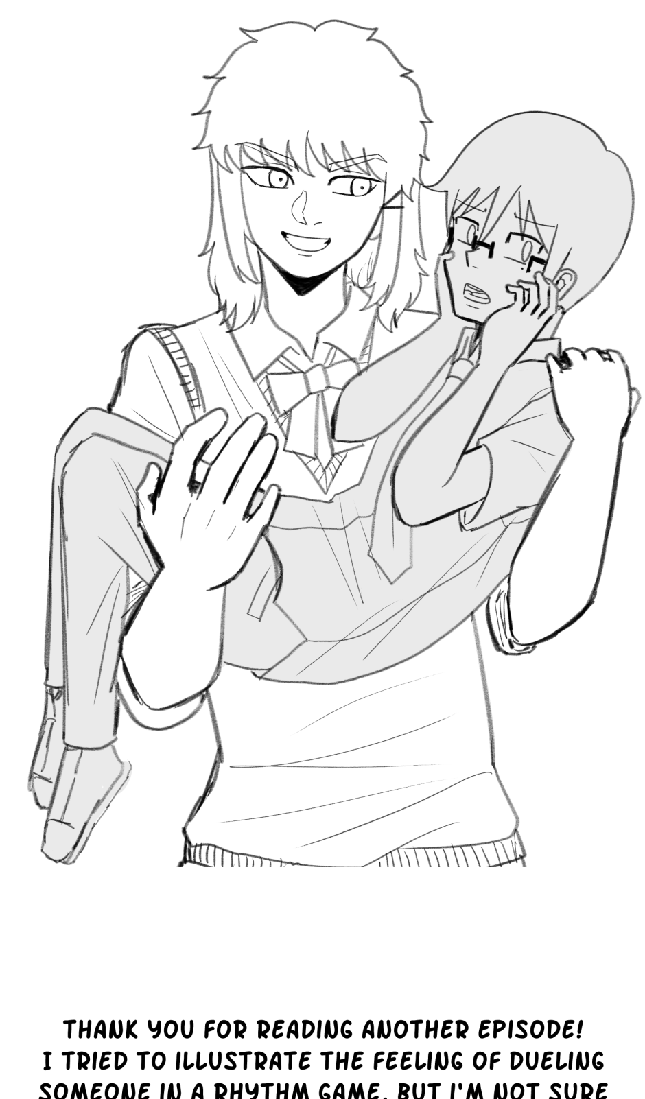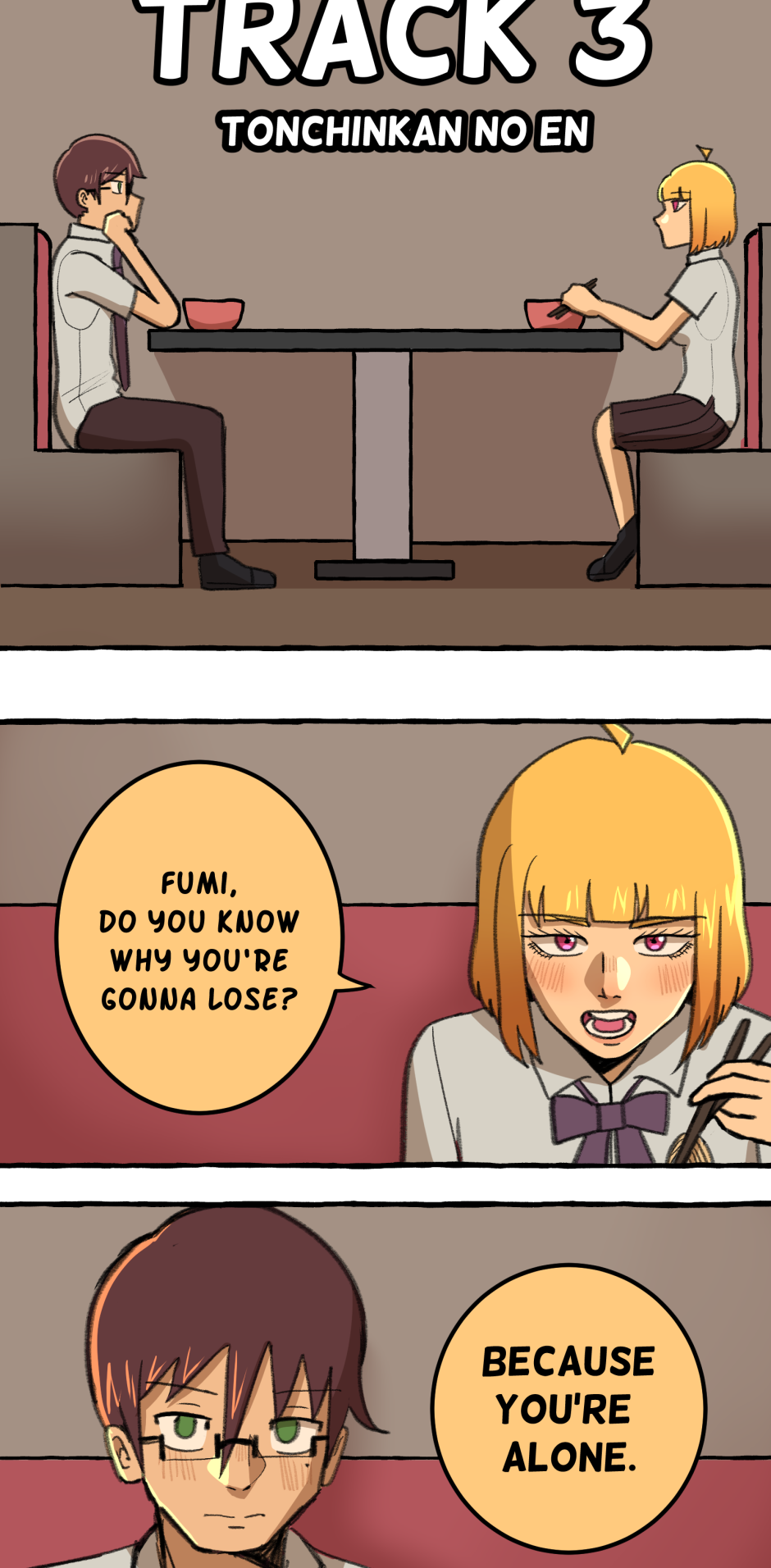 Fumi's school has a hierarchy based on their skill at rhythm games. However, he sucks at rhythm games, and is barely hanging on in the school rankings! A transfer student comes and declares that she'll take over the school and get rid of the ranking system! She wants him to climb to the top with her, but will he be able to catch up? Updates biweekly on Tuesdays, at least until I explode!