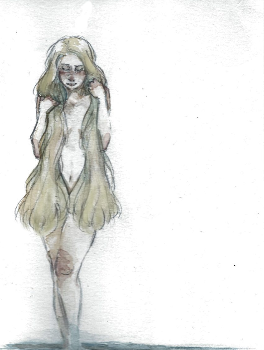 Trying my hand at watercolors. Pretty little Lauralie about to take a bath. ....I really wish I had her hair, lol.