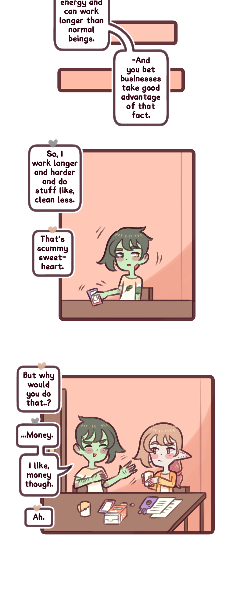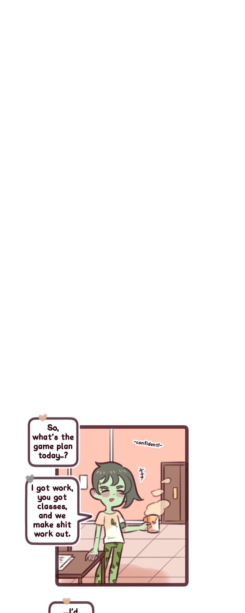 A weird, warming, slice of life about Grey Winters a forgetful zombie who recently moved back into the magical town of Grave sugar (populated by undead magic, spirits and monsters) with his lover an Elf named Lucas. Now they're navigating growing up and working 6 hour shifts, learning magic and spells, love and friendships and making grilled cheese for dinner as they make it all work out. Updates: Bi-weekly!