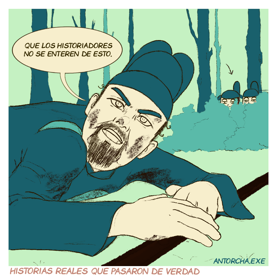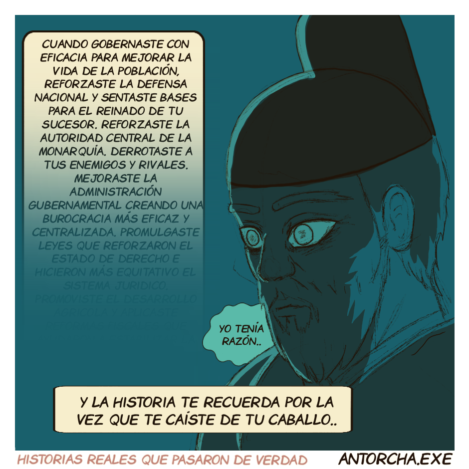 «El propio rey montó a caballo y disparó flechas a un ciervo. Sin embargo, el caballo tropezó, haciéndole caer, pero no resultó herido. Mirando a su alrededor, dijo: «Que los historiadores no se enteren de esto».