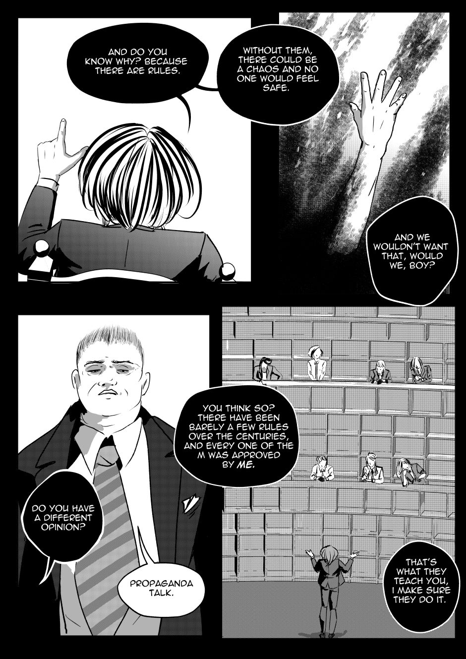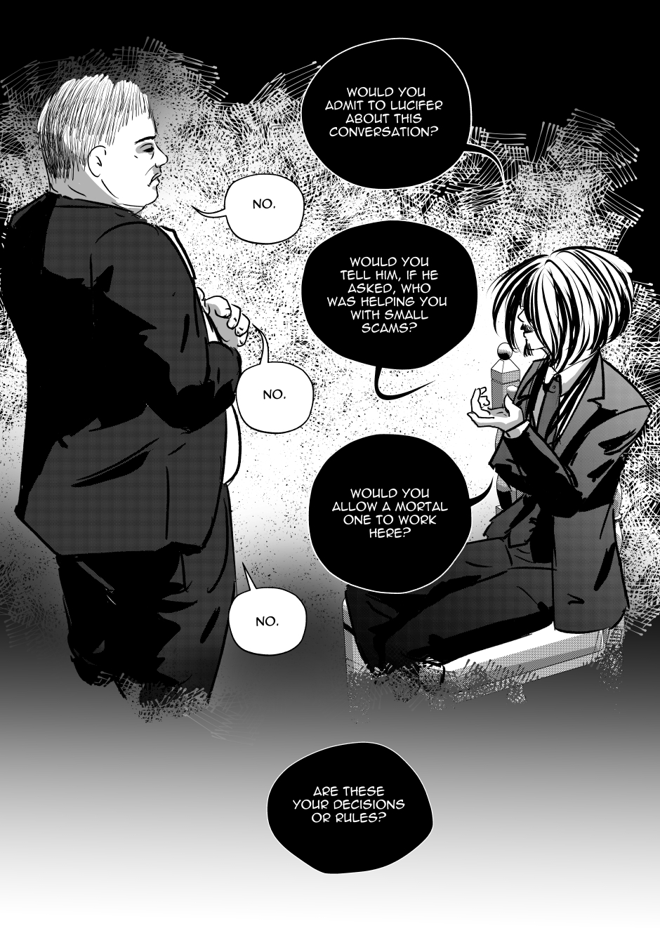 In a hellish world where law and conspiracies clash at every turn, a brutal power struggle erupts. Mephistopheles, the master of pain who rules over demons from the shadows, faces an unexpected challenge from Otto - a young, plump bureaucrat who unexpectedly takes a position in the throne room. Otto, faithful to the letter of the law, tries to hold Mephisto accountable, thus violating a centuries-old order of things.