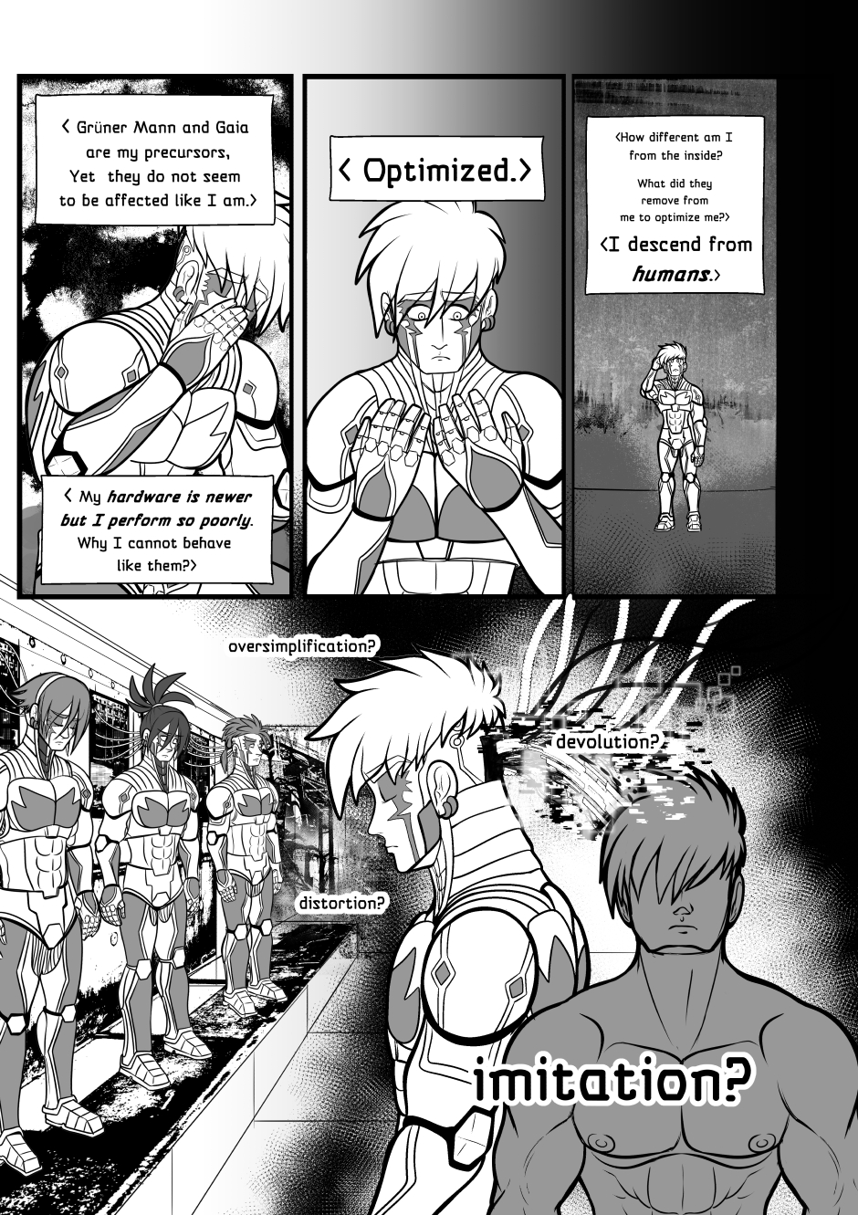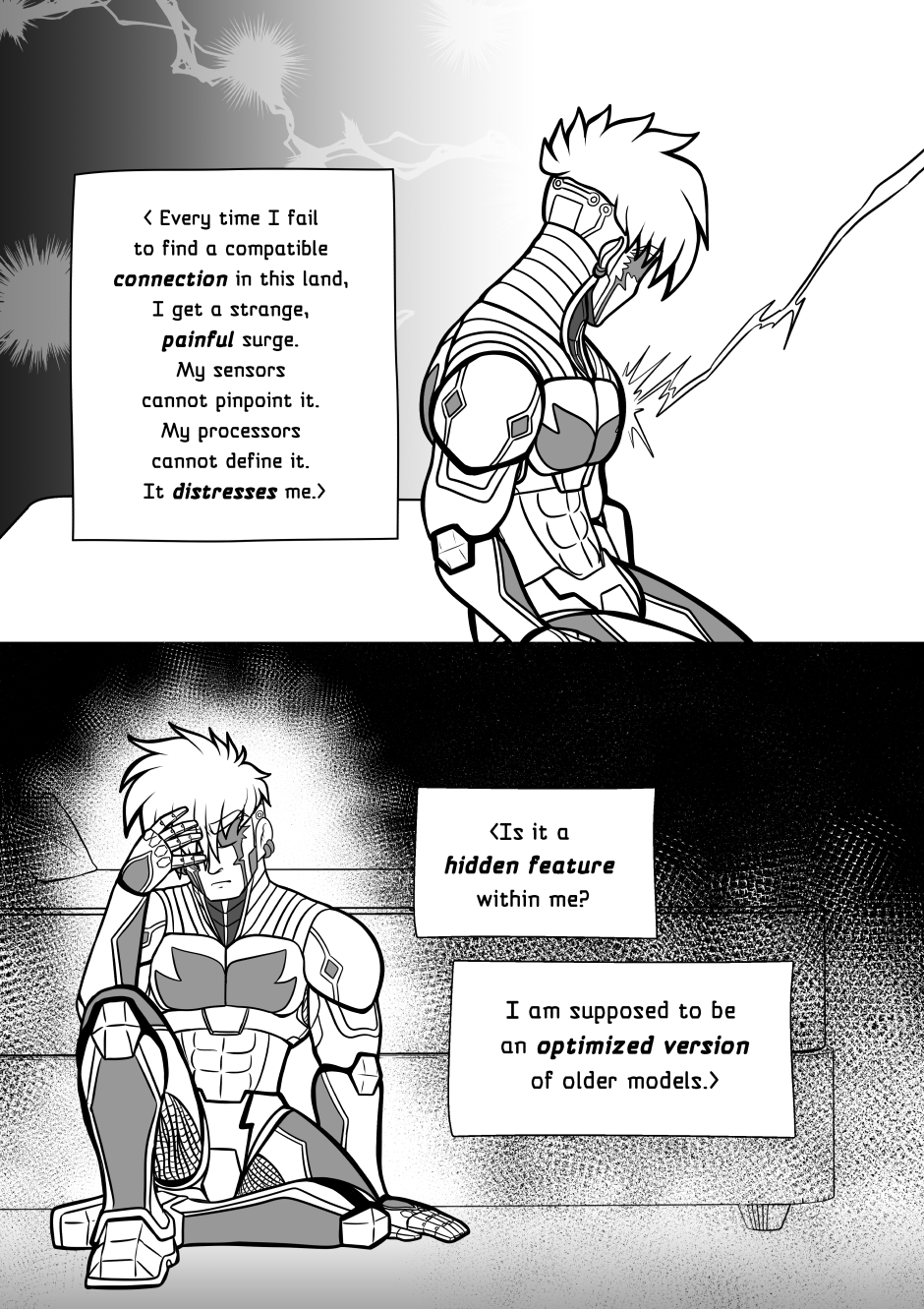 Crisanto is a cyborg soldier created to defend a newly stablished off-world colony. However, more than battles he yearns of companionship, concept that in his world is not embraced. Then he meets Brant, a cyborg who has just arrived from a scouting mission on Earth, and recently got transferred to the same base he is in. They get to know each other and their relationship develops.