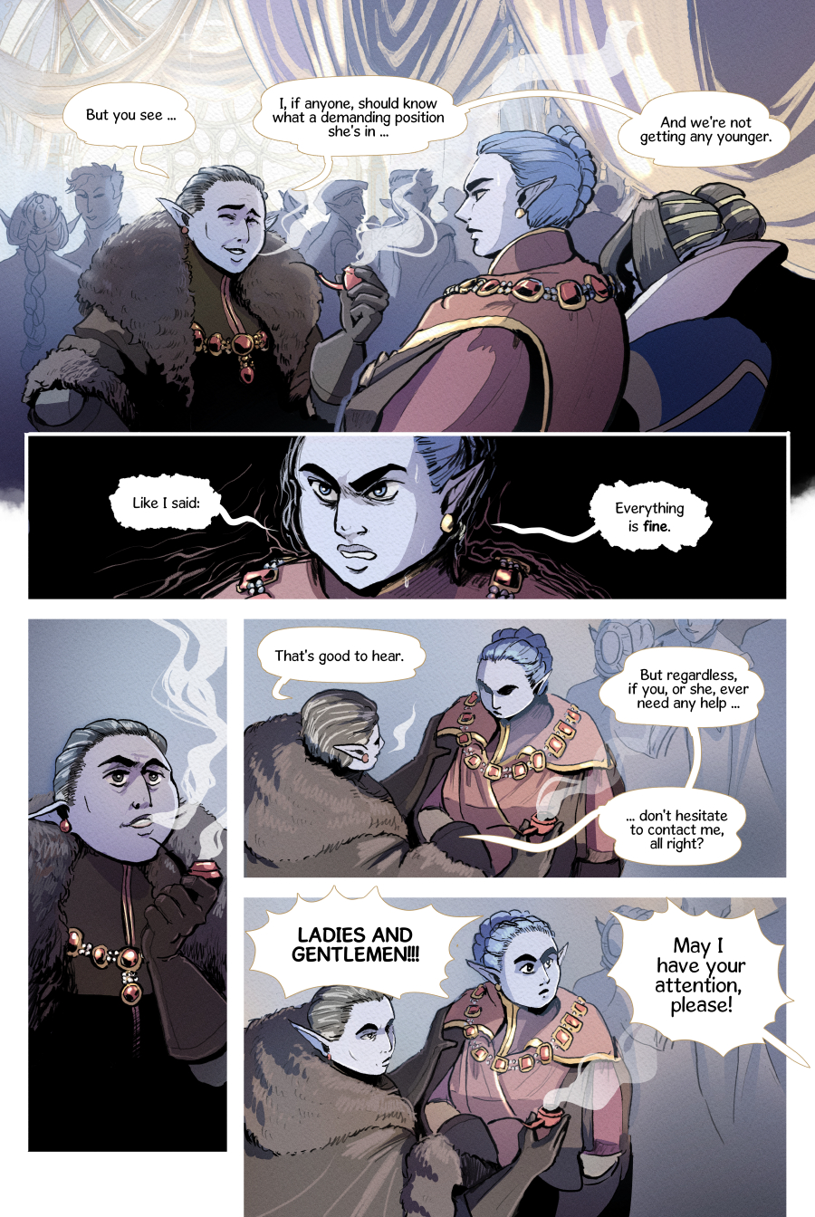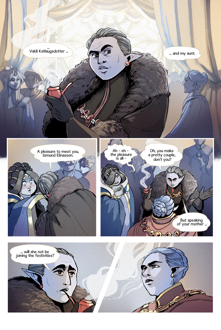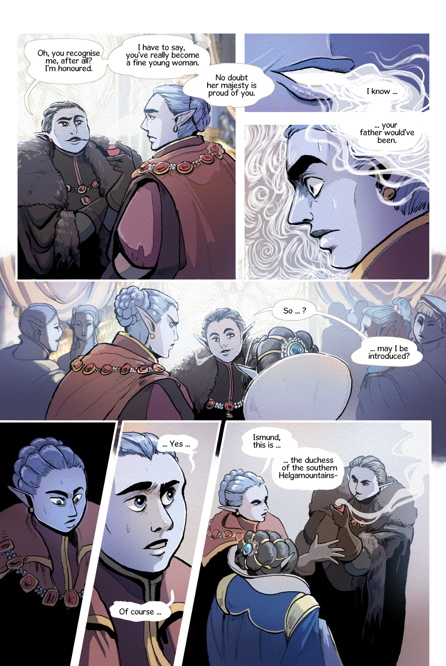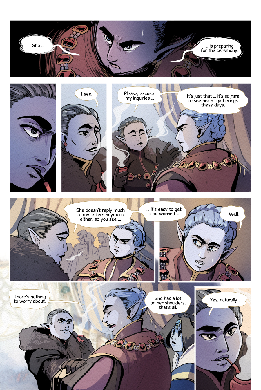 At the peak of the world lies Svalverfi, a city veiled in eternal winter. The queen's holy fire keeps it from ruin, but as she grows weaker, so does the flame. Who will succeed her before it's too late? The troubled princess Ragnhild or the decadent prince Heidrek? So begins a family feud that will decide everyone's fate. In the midst stands Ismund: a newcomer who, like the throne, is torn between sister and brother. Empyrean is a queer court-drama in a society with reversed gender roles