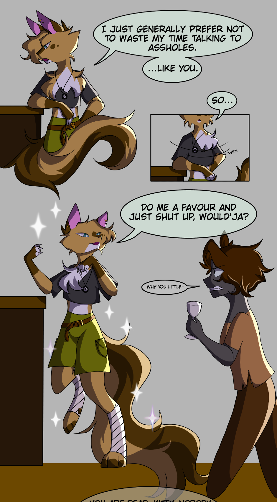 Tabaxi Bard Yam didn't think she needed anyone else in her life. And she was right, for the most part- all she wanted was her fox-crow Bread, her pair of silver sickles and a bit of meat once in a while. But one day a strange, irritating Gnome drops into her life and changes everything. Soon after that, another newcomer, a Tiefling, appeared, and then, a Half-Elf. What was going on? Why couldn't she just make it to 24 without interacting with anyone? Was that so much to ask?