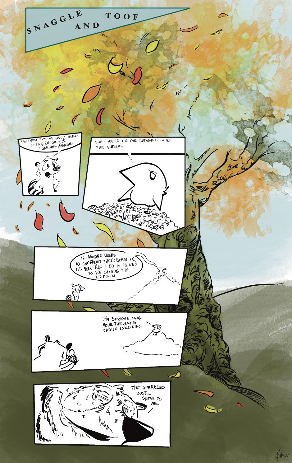 This might be the only place where you'll find a racoon (Snaggle) and a raven (Toof) both digging through the trash while also contemplating the effects of consumerism.