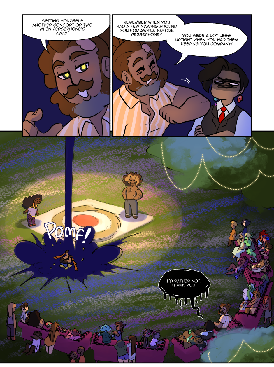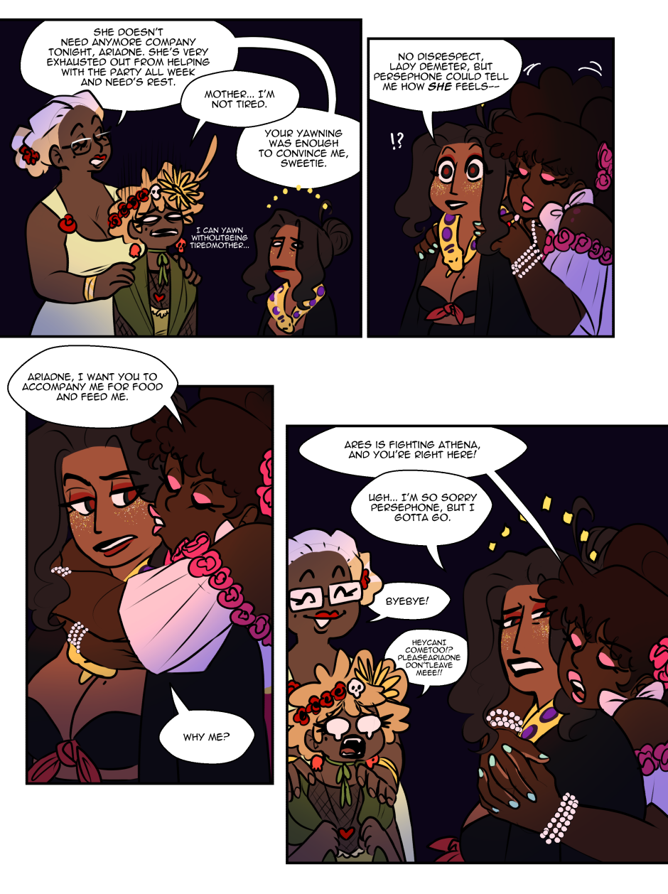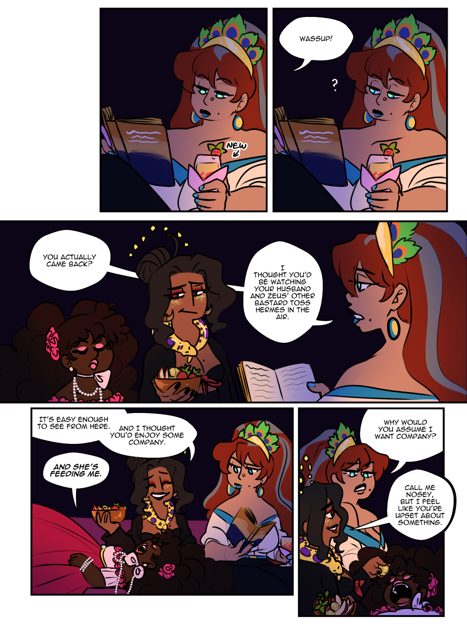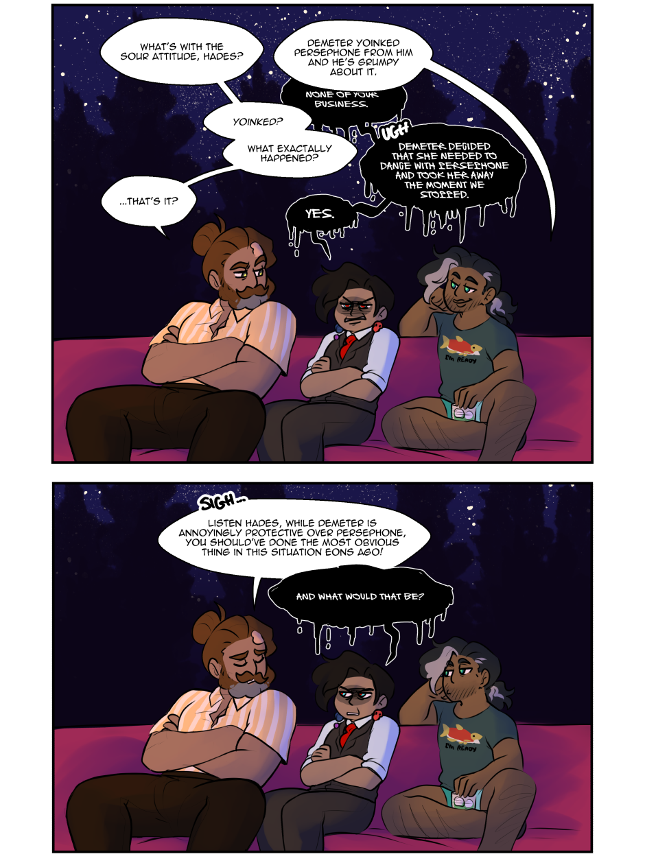 The fact that even after aaalll these years Demeter still is so Ehm controlling? over protective? possessive? With Persephone her ADULT daughter that she even speak for her, no wonder Persephone finds way to be a little petty with her, having her as a mother must be exhausting 😅