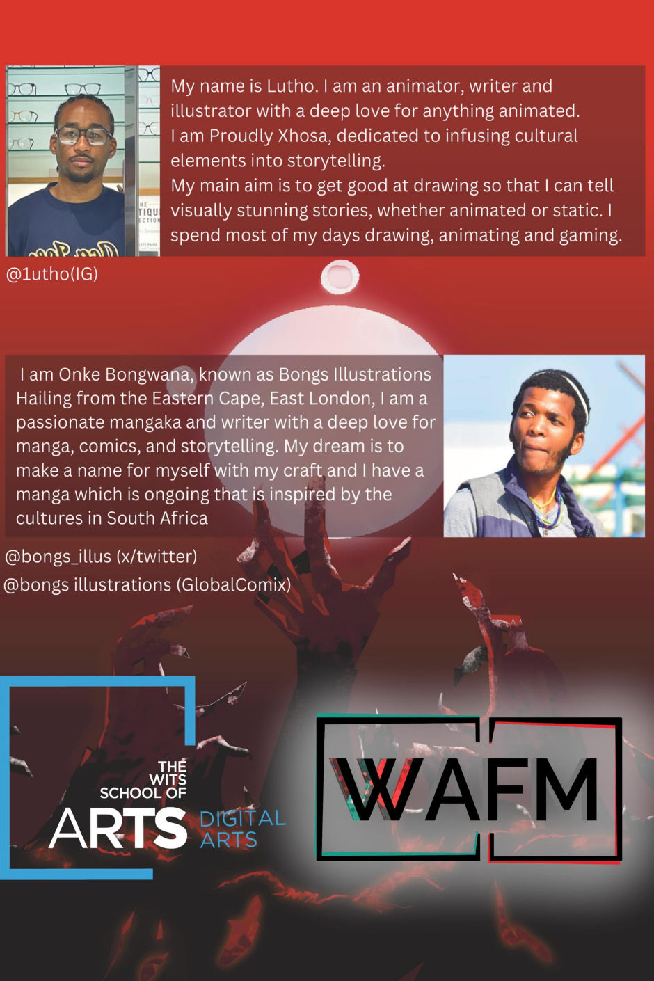 We commend our students, who put all of their blood, sweat and ink into making this project happen. Without them, AfroManga would not exist. We would also like to thank the Wits Digital Arts Department for their continued support. Without them, we wouldn’t be able to run our pseudo-studio. Finally, we would like to thank you, reader, for supporting our initiative and engaging with our work. Without you, our stories would fall into silence.