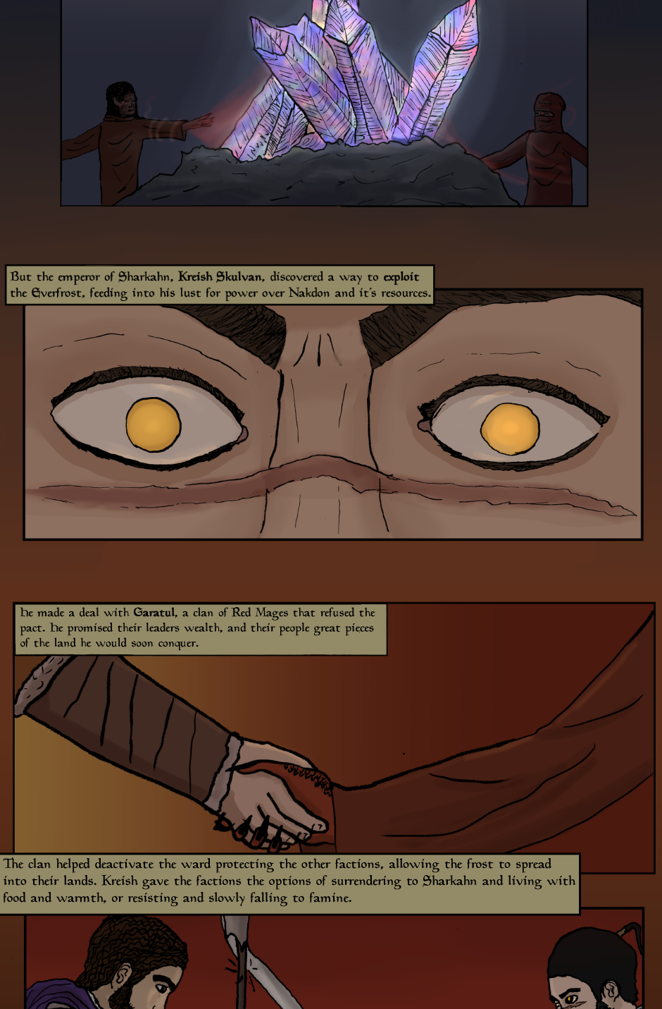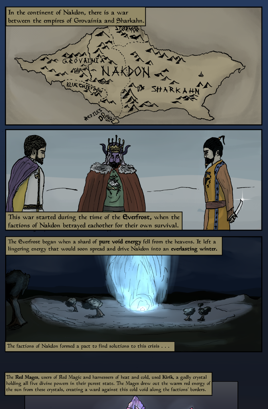 The continent of Nakdon lies at the center of the world of Glainadon. It is a holy land to every religion, and holds magic touched by the gods themselves, but every holy land breeds war. The empires that were built upon these wars were humbled by the divines when the Everfrost struck. The lands froze, and now they fight for resources. In these times many wish to see justice and change, but as new wanderers attempt to fight for peace, what will set them apart from the hundreds before them?