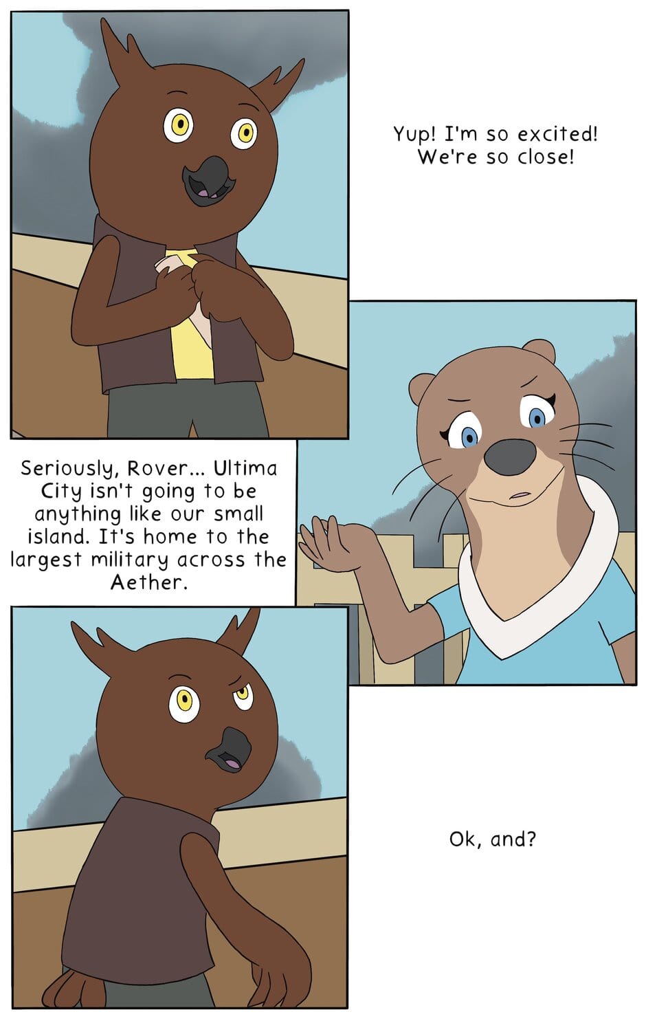 In a world filled with countless airships, flying marine life, and floating islands, the Aether is home to many. Just below is the planetary body everyone calls the Aqua Abyss because the entire surface is covered in water. This story follows Beatrix the otter and her younger brother, Rover the owl as they travel across the Aether in search of their missing father or Rover's biological family. But no matter how far they go, their biggest obstacle will be overcoming the differences between them.