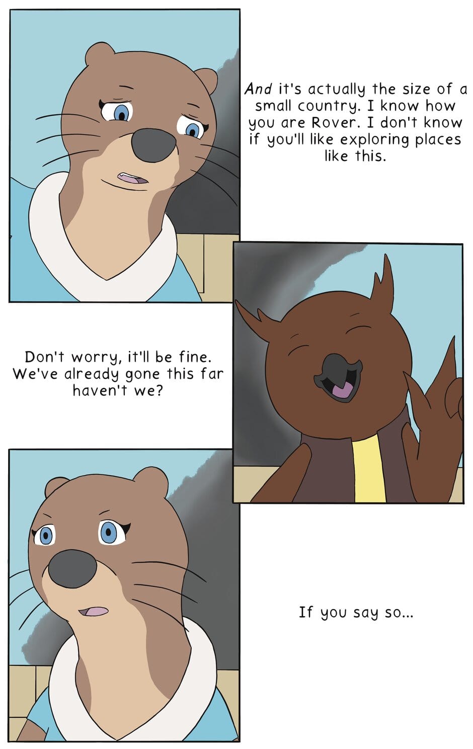 In a world filled with countless airships, flying marine life, and floating islands, the Aether is home to many. Just below is the planetary body everyone calls the Aqua Abyss because the entire surface is covered in water. This story follows Beatrix the otter and her younger brother, Rover the owl as they travel across the Aether in search of their missing father or Rover's biological family. But no matter how far they go, their biggest obstacle will be overcoming the differences between them.