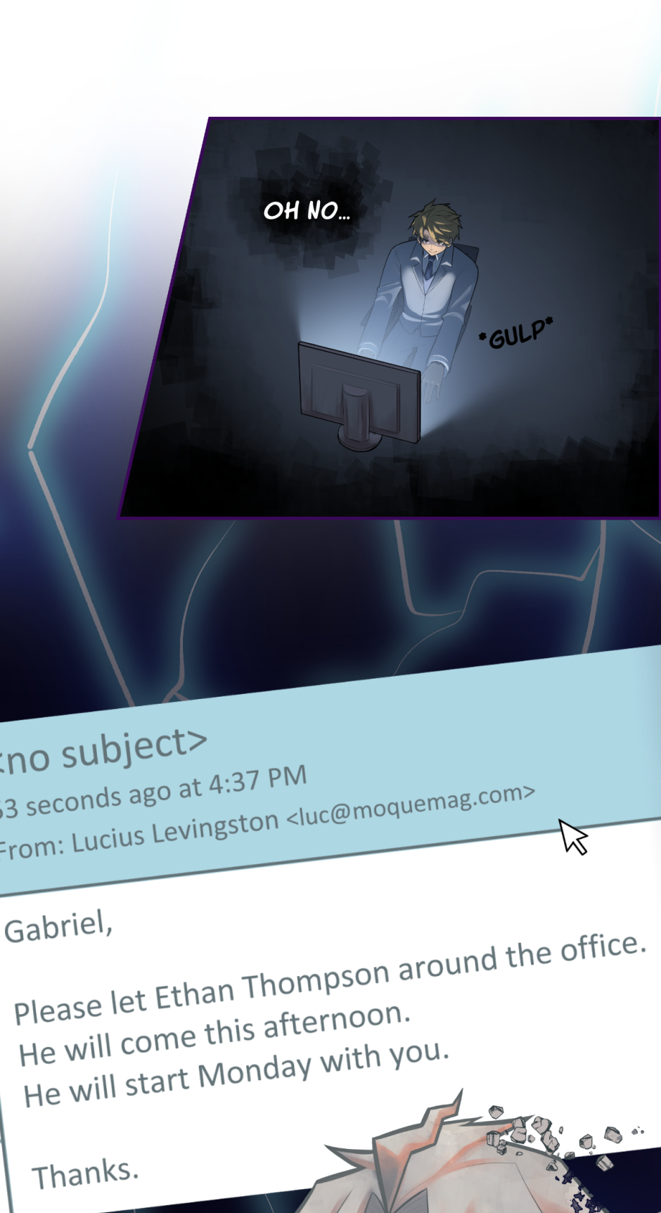 Ethan Thompson, a cocky private investigator hired by the CEO to find who started the story, takes a liking towards the former model as he digs for information.