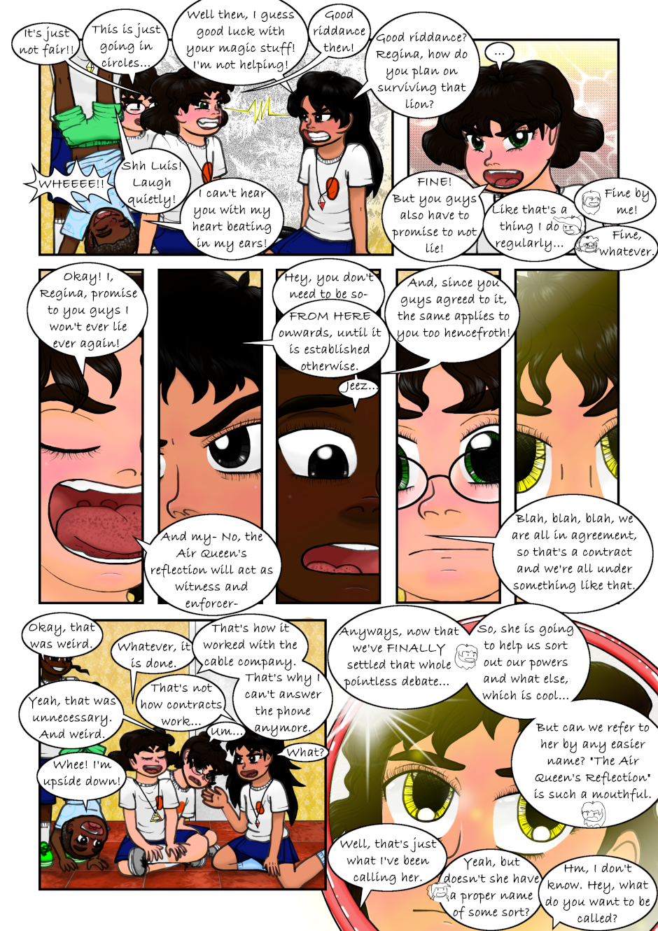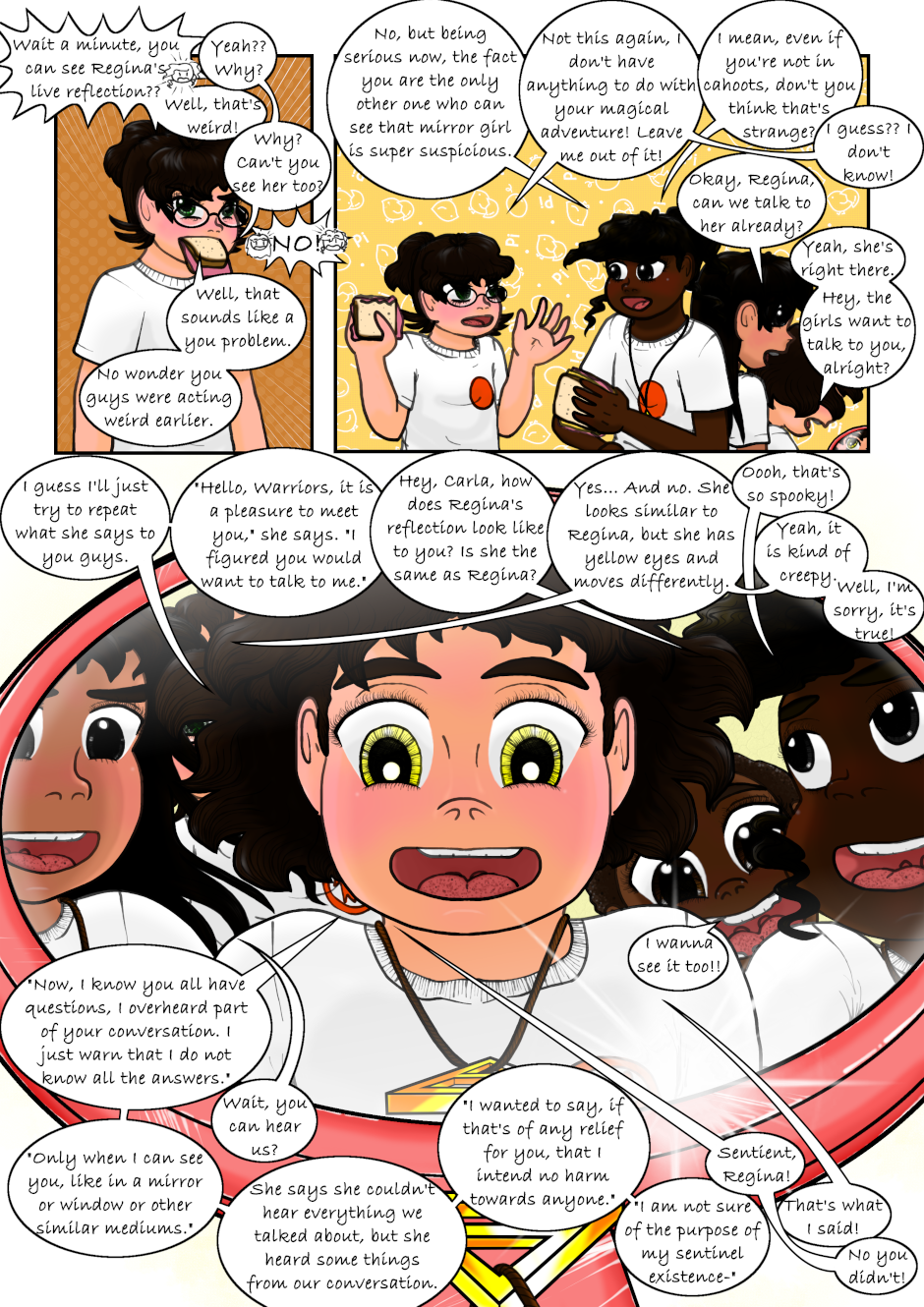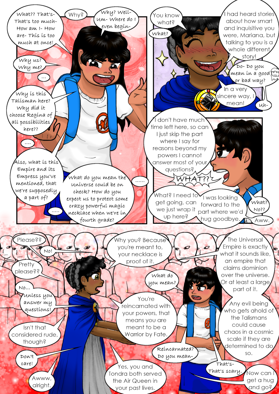 The Clairvoyant told Regina she has to seek the Air Necklace to guard it, and told her to find the Warriors. Regina accidentally found a magical necklace that made her and a couple of her classmates turn into magical girls. Also, a talking flying lion is after them. Not to mention Regina's reflection speaks to her now. What a mess, can anyone Regina, Mariana or Tondra what is going on?