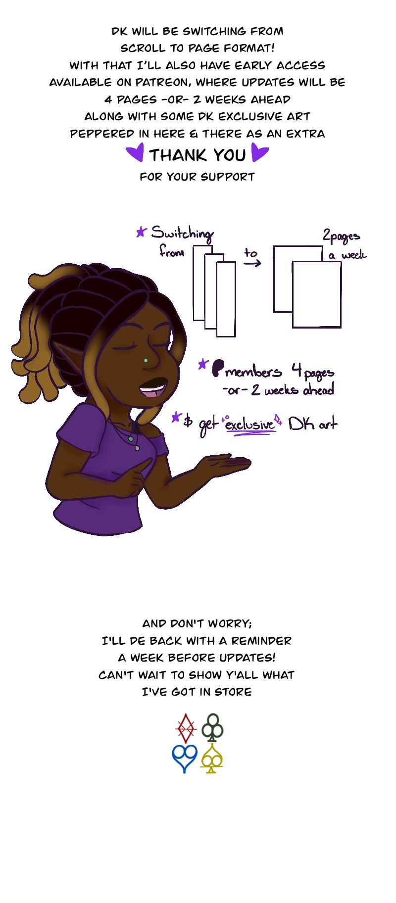 First 2 Mondays, ♣️Clubdom Citizens♣️ (over on Patreon) will have 4pages to forge ahead then drop down to 2page updates and remain 2 weeks ahead of regular updates!! (geez I hope that makes sense 😅) Regular updates will be 2pages every Monday~