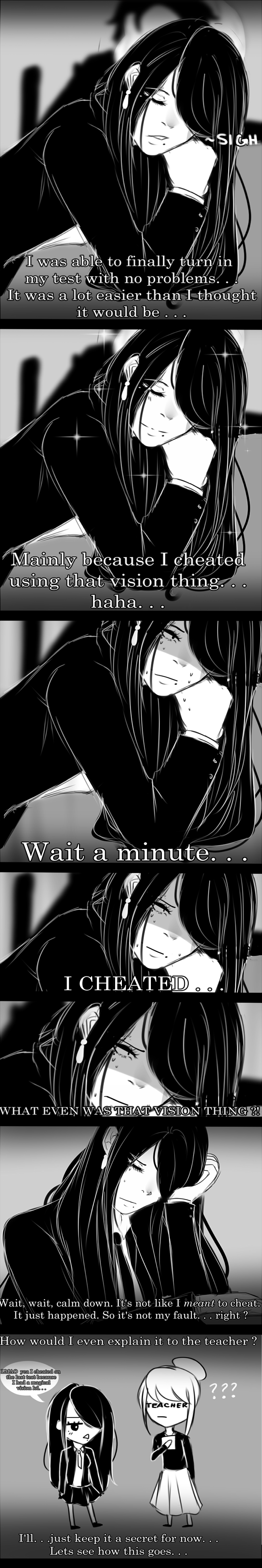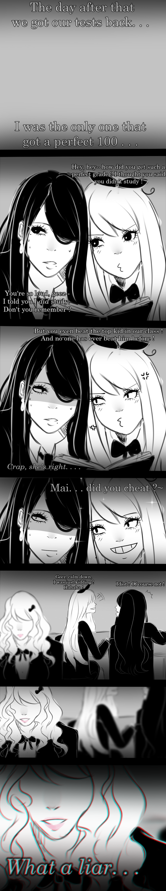 After recieving back her test, Mai discovers that not only did she get a perfect score but she managed to beat the best student in her class with the help of the mysterious vision of the test answers. Trying to keep it to herself, it's no help when her friend, Reiko keeps blabbing about it. With her constant chatter, it grabs someone else's attention. . .