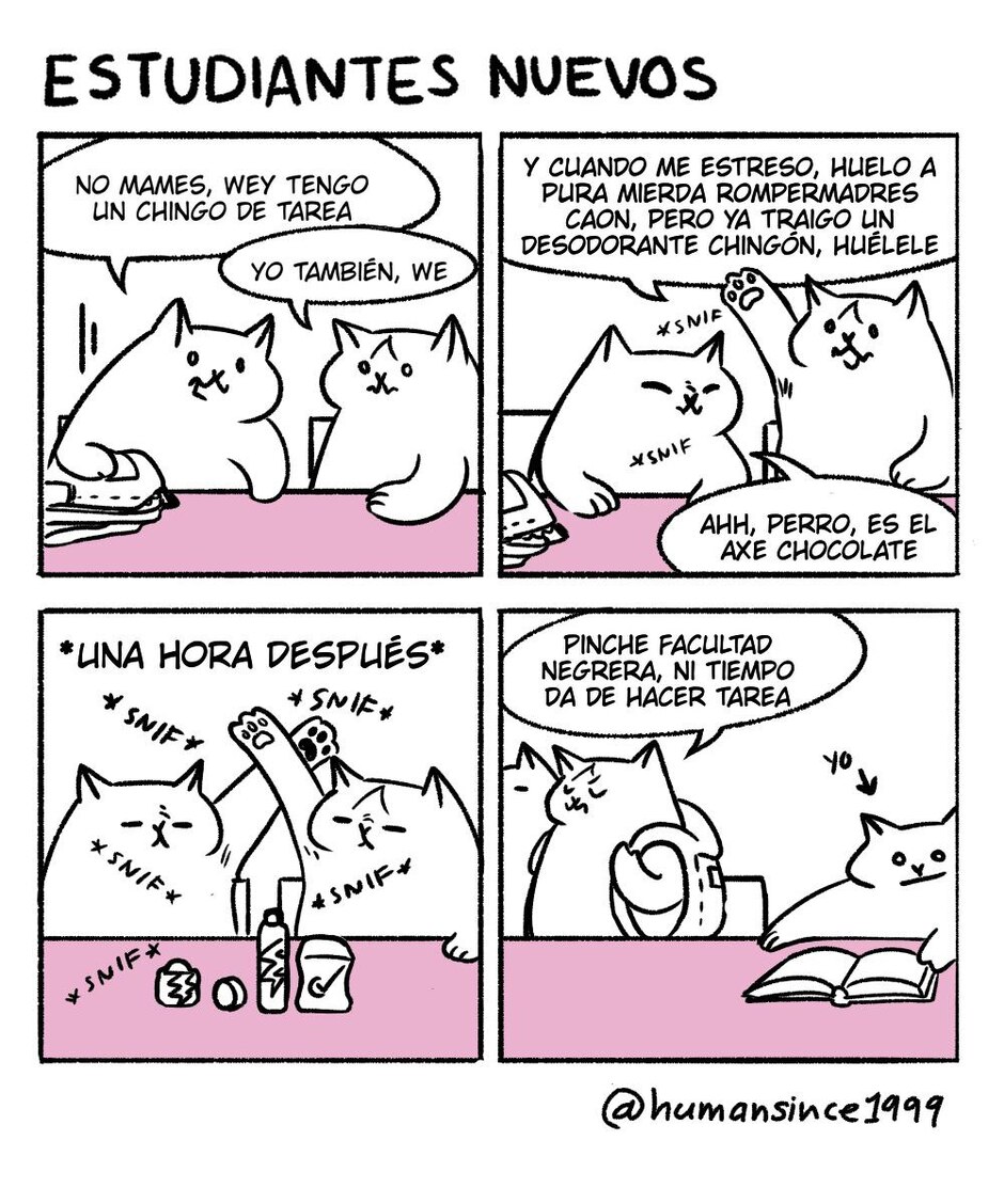 Viñetas sobre la vida universitaria. Las vivencias de los gatos se inspiran en mi experiencia como estudiante de Física en la UNAM, aunque hay chistes locales, sus desventuras pueden resonar con todos.