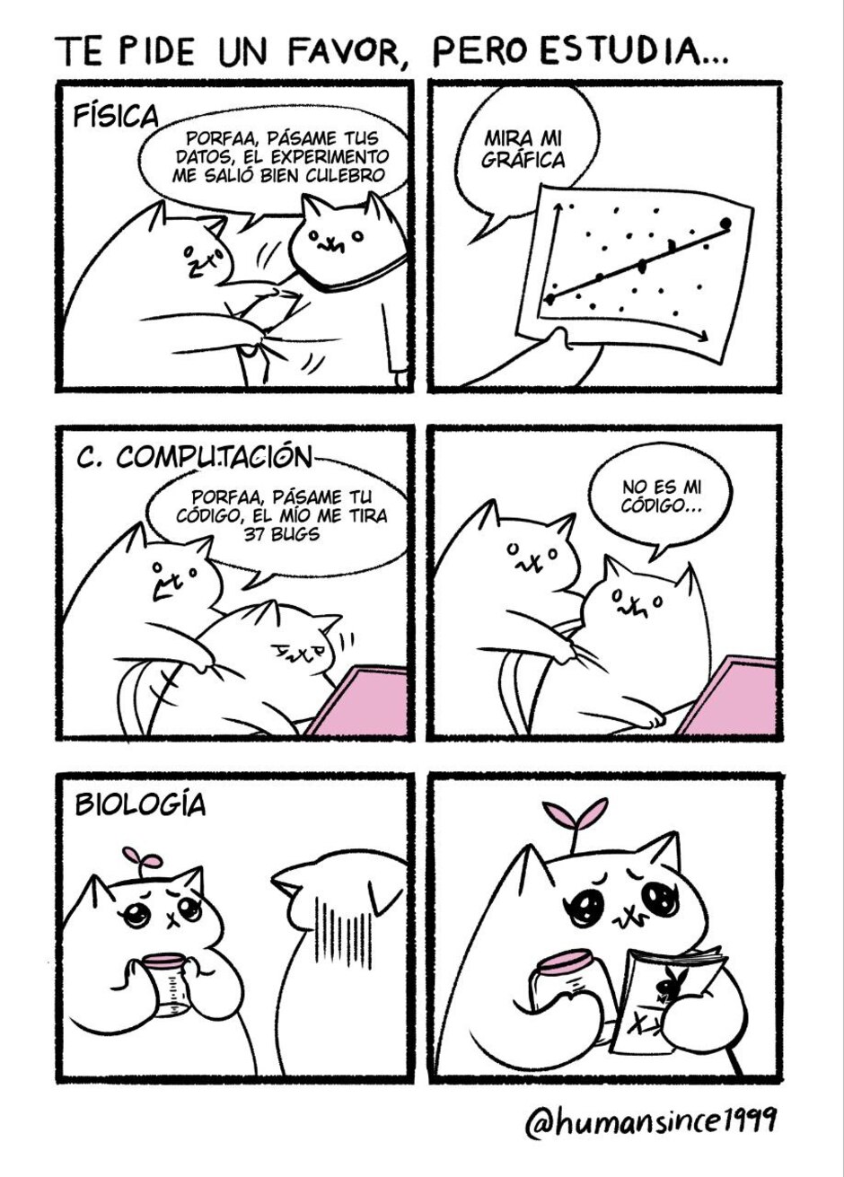 Viñetas sobre la vida universitaria. Las vivencias de los gatos se inspiran en mi experiencia como estudiante de Física en la UNAM, aunque hay chistes locales, sus desventuras pueden resonar con todos.