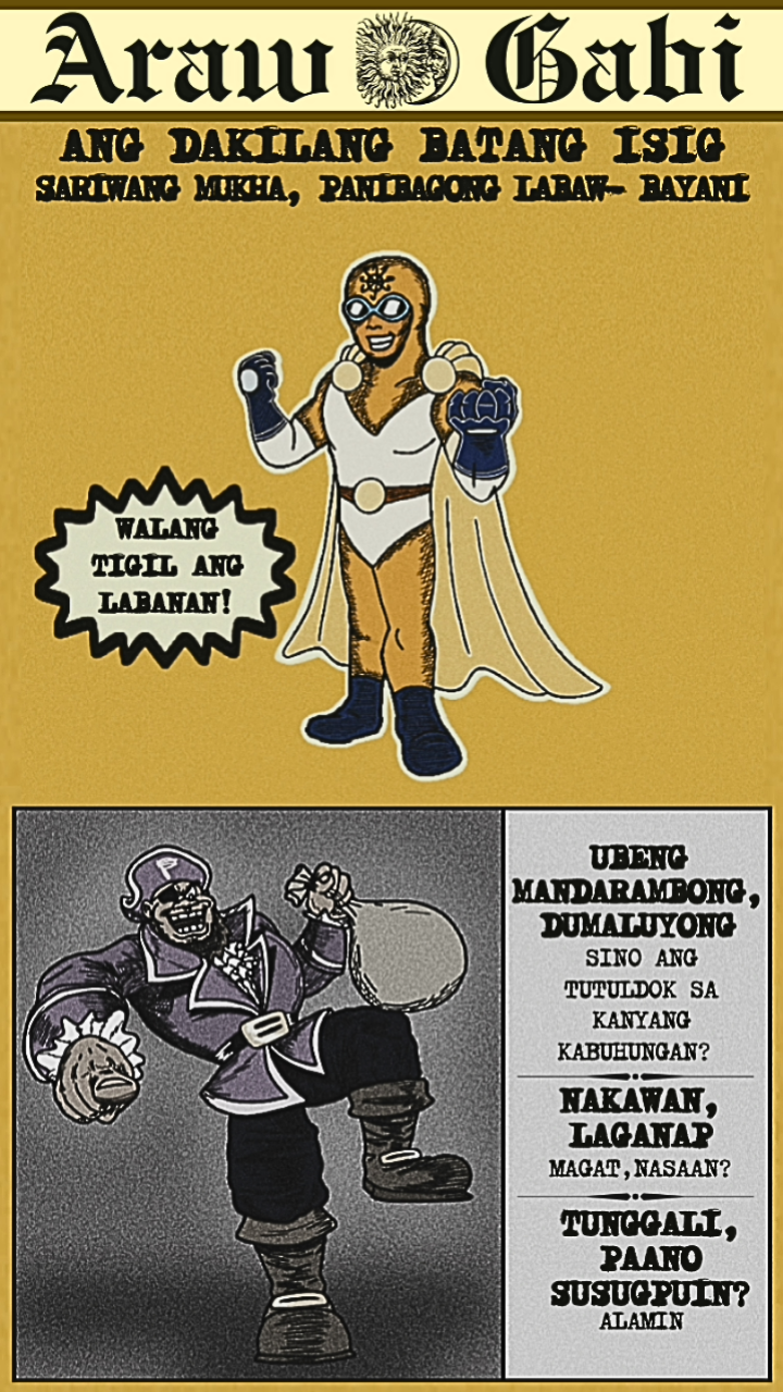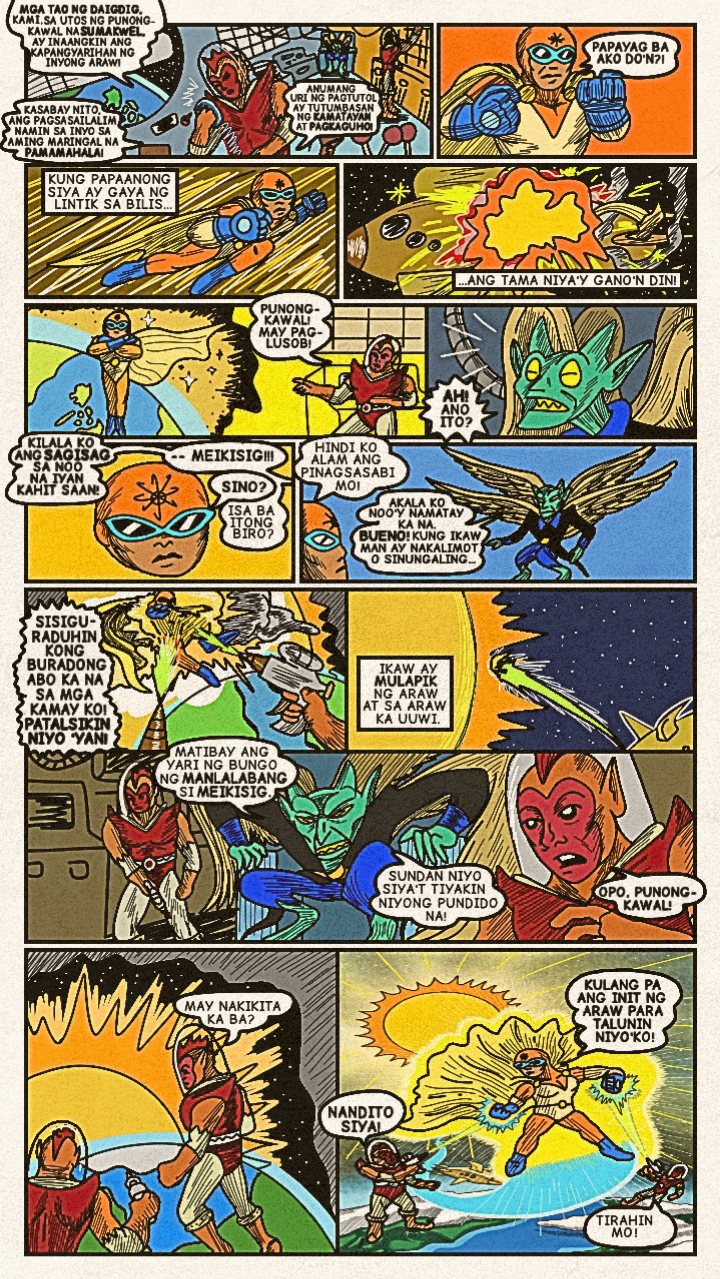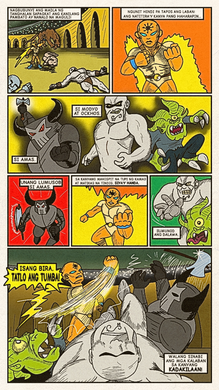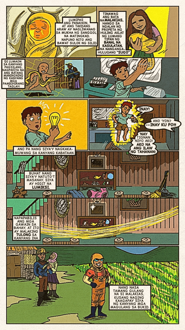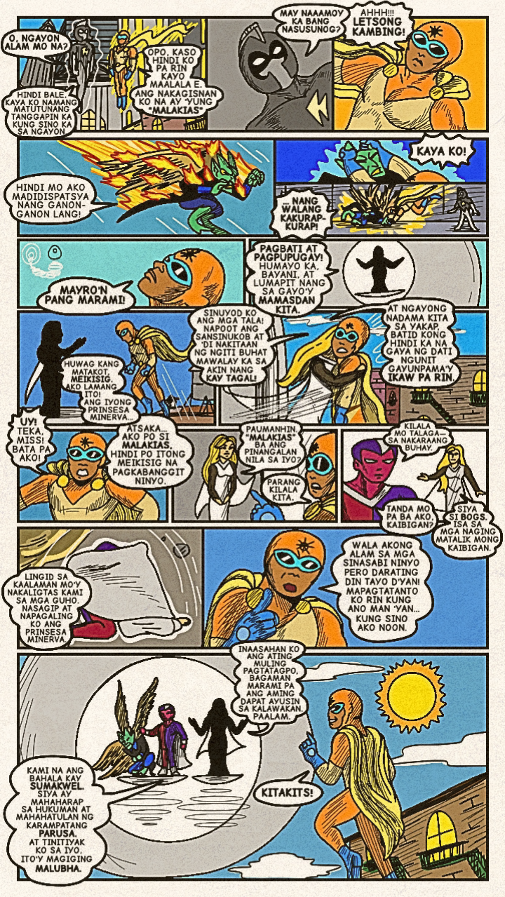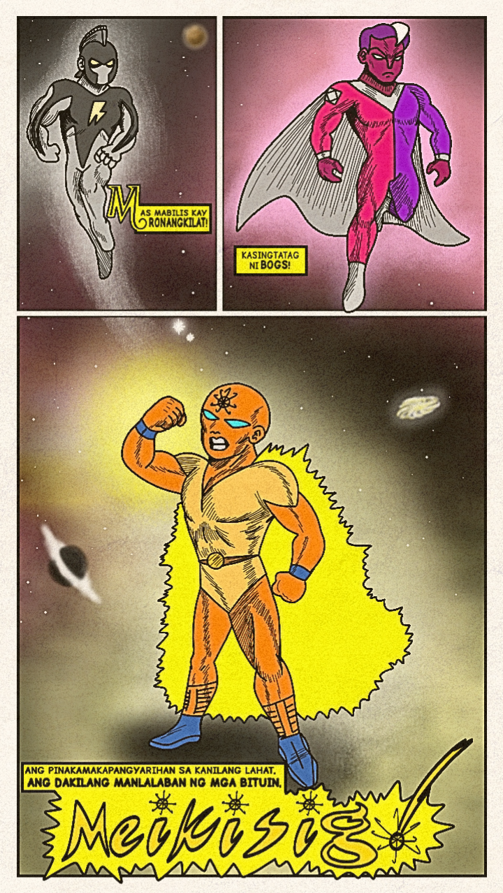 Originally published in April 2024, a new face dons a bright costume and enters the arena! Once the great space- gladiator, Meikisig, reborn as a rice farmer's son, Malakias uses his powers to help the needy and fight evildoers as the new hero in town— Batang Isig!