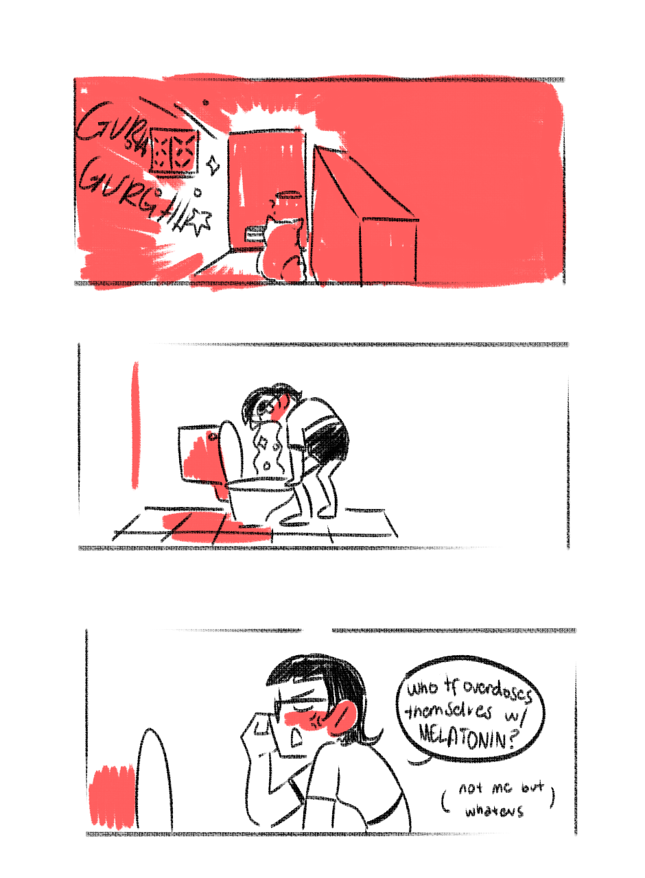 There was a time when I attempted by overdosing myself with melatonin pills. Obviously it was the dumbest idea, puked a ton that day. But I got really good sleep though <33333
