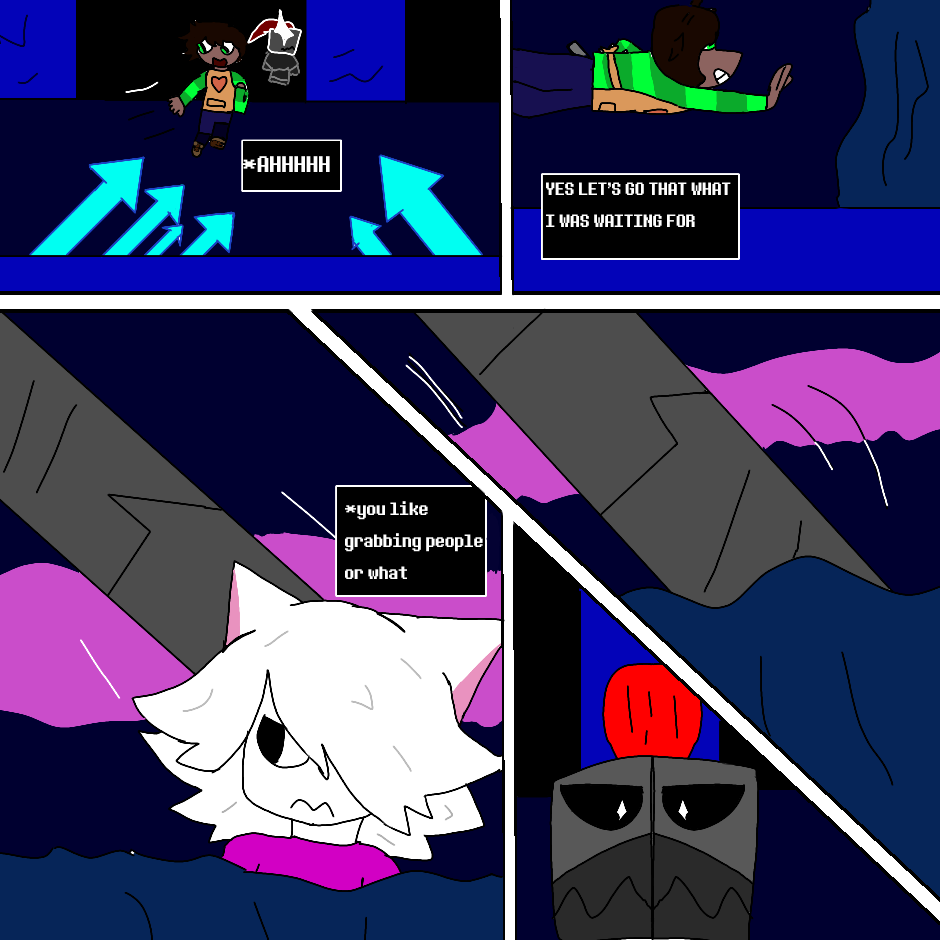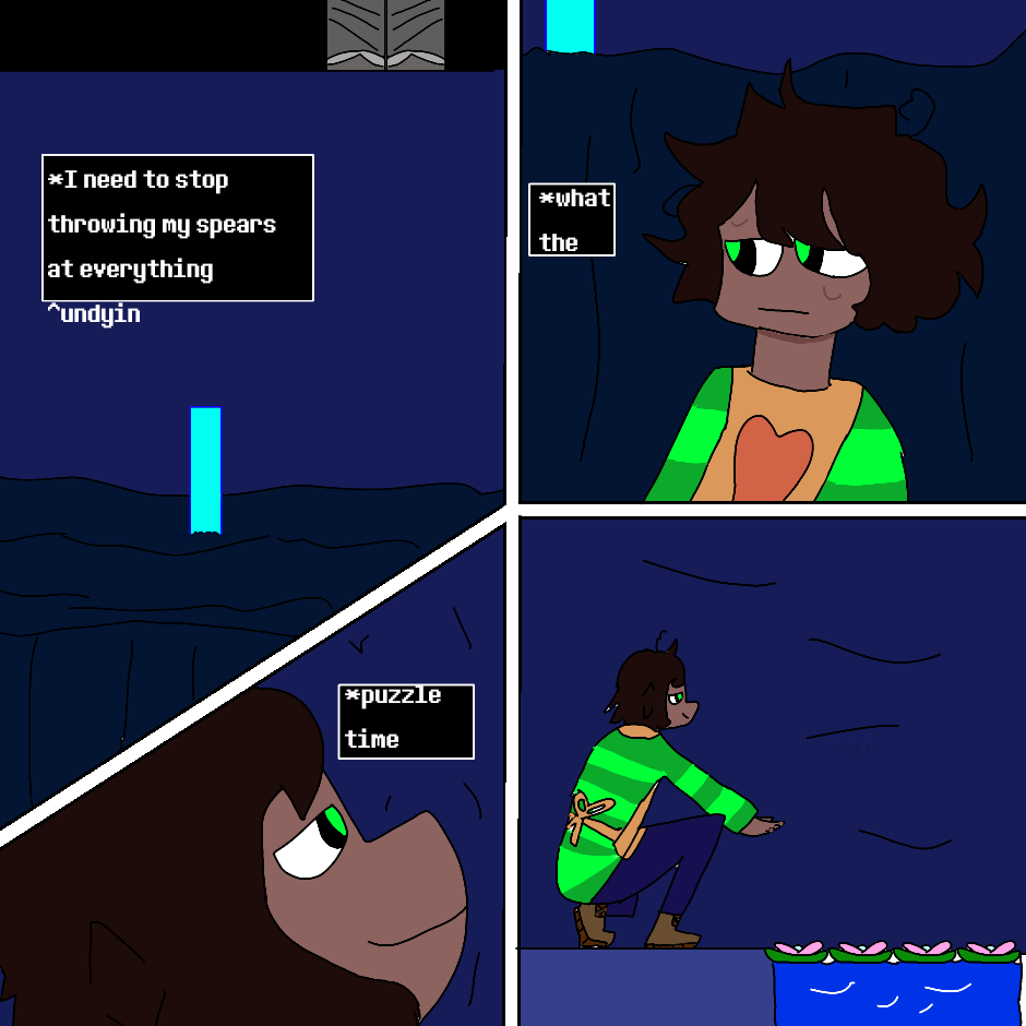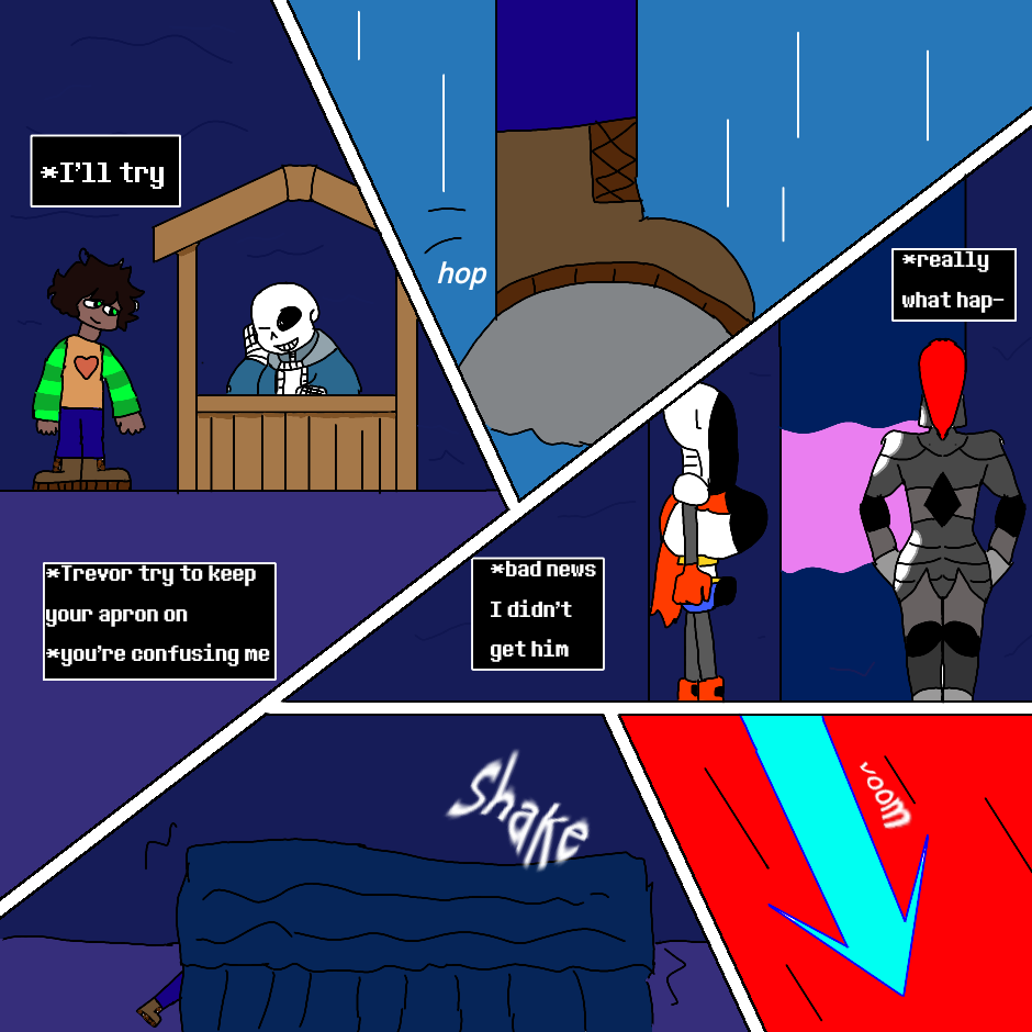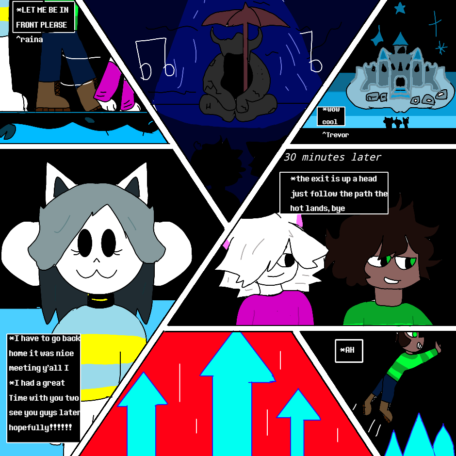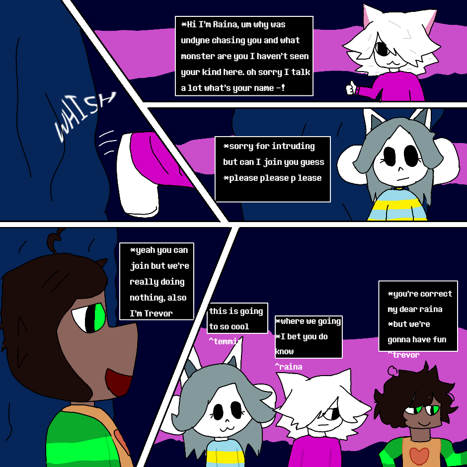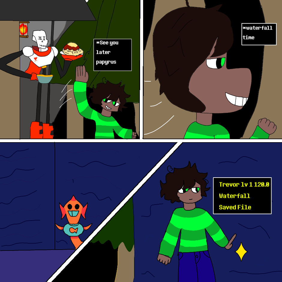 After hanging out with papyrus Trevor the kindness soul he get into the water fall then gets chased by undyne then meets Raina and temmie
