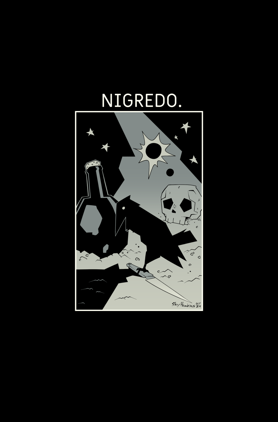 Nigredo is the first stage in the alchemical Magnum Opus. It is the stage when all ingredients must be plainly laid out and cleansed, and the alchemist must confront the darkness within and without.