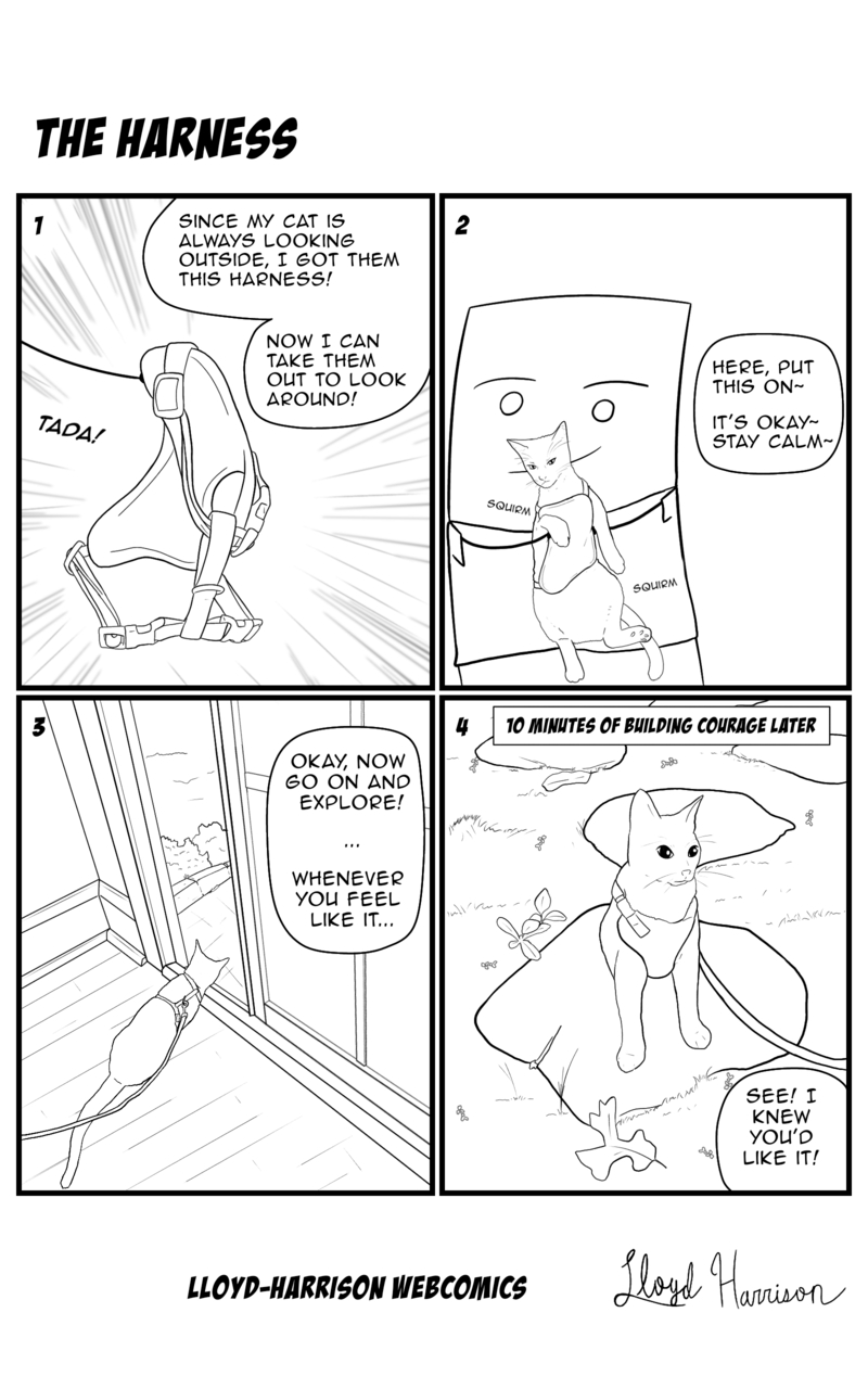 Day 3 of daily comics! Today I went looking for a harness for my cat who's always looking outside longingly. After some resistance, they we're so happy to explore around!