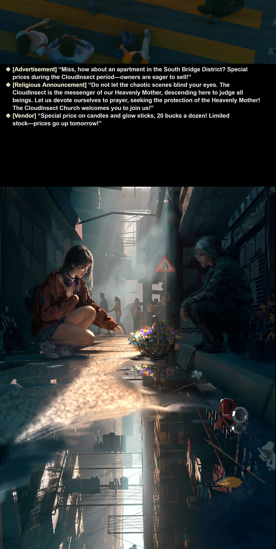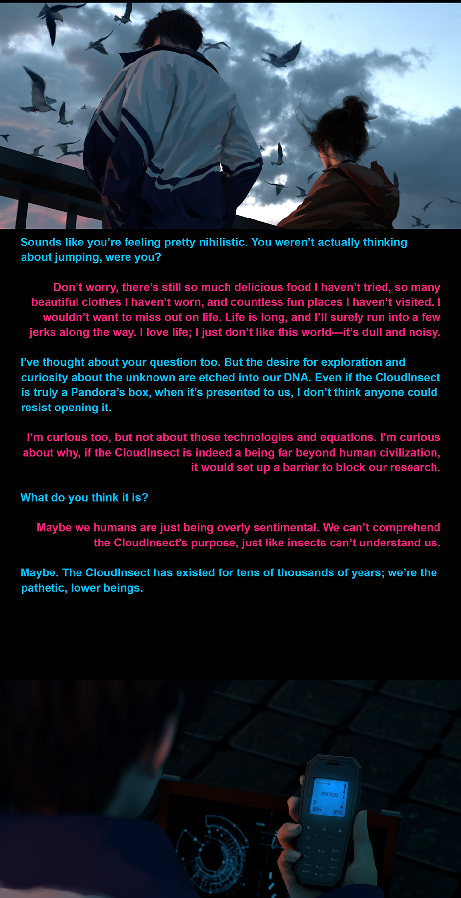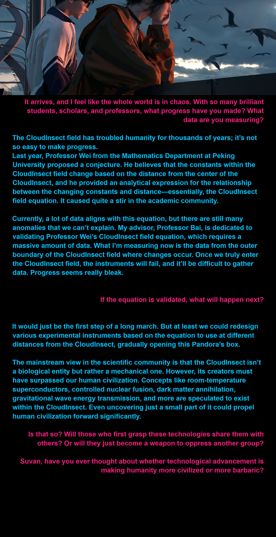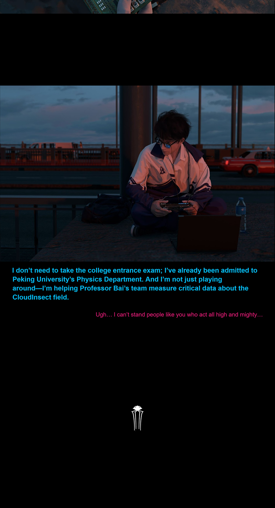 For thousands of years, twelve colossal "CloudInsects" have walked the Earth, each surrounded by a mysterious "CloudInsect Field." Within these fields, all electronic devices cease to function, adding to the enigma. There is still no consensus in the scientific community about the true nature of the CloudInsects—whether they are machines or living organisms. The prevailing theory suggests that these giants are ancient probes left behind by an advanced extraterrestrial civilization during a prehistoric visit to Earth. Despite humanity's continuous fascination and attempts to study the CloudInsects, progress remains hindered by the presence of the CloudInsect Fields, leaving even the most advanced technologies powerless to unlock their secrets.