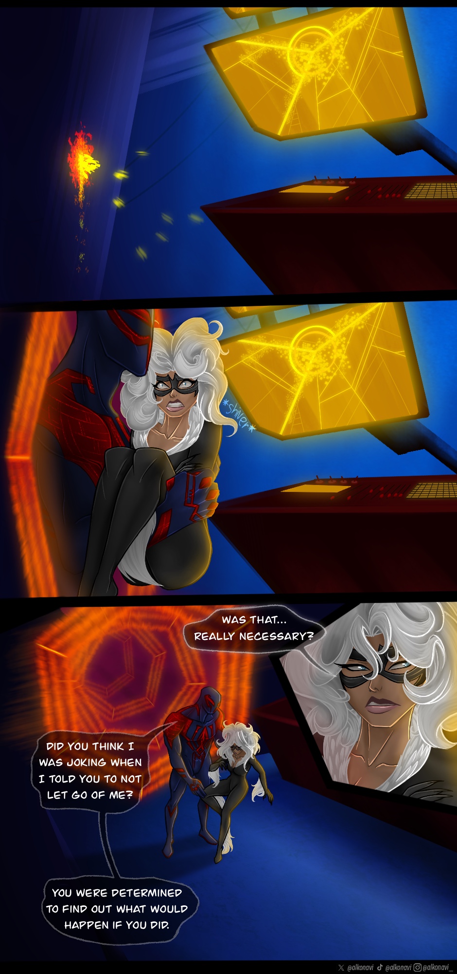 Miguel O’Hara aka Spider-Man 2099 consistently operates under the effects of an addictive drug called “Rapture” to permit his spider-like abilities and features. But when his supply of Rapture has depleted, he has to undergo the mission of breaking into Alchemax and stealing more. He looks to none other than Black Cat - A well-endowed, cunning and physically-skilled cat burglar of the Spider-Man canon — for assistance in such a task. A specific noted barrier - Black Cat always falls for Spider-Man. And in order to protect the canon, he sets out to find Feliçia Hardy of Earth 777, the Black Cat with a burning hatred for Spider-Man and a hatred that works in Miguel’s favor. Reluctantly agreeing to aid him in his mission, Feliçia teams up with Spider-Man 2099 to retrieve the Rapture and return him home safely before his timed next dose, and the body’s rejection known as “The Final Hour”.