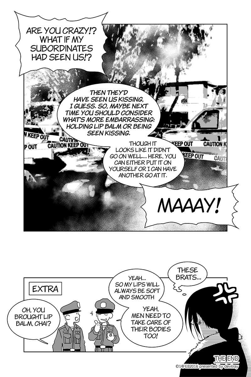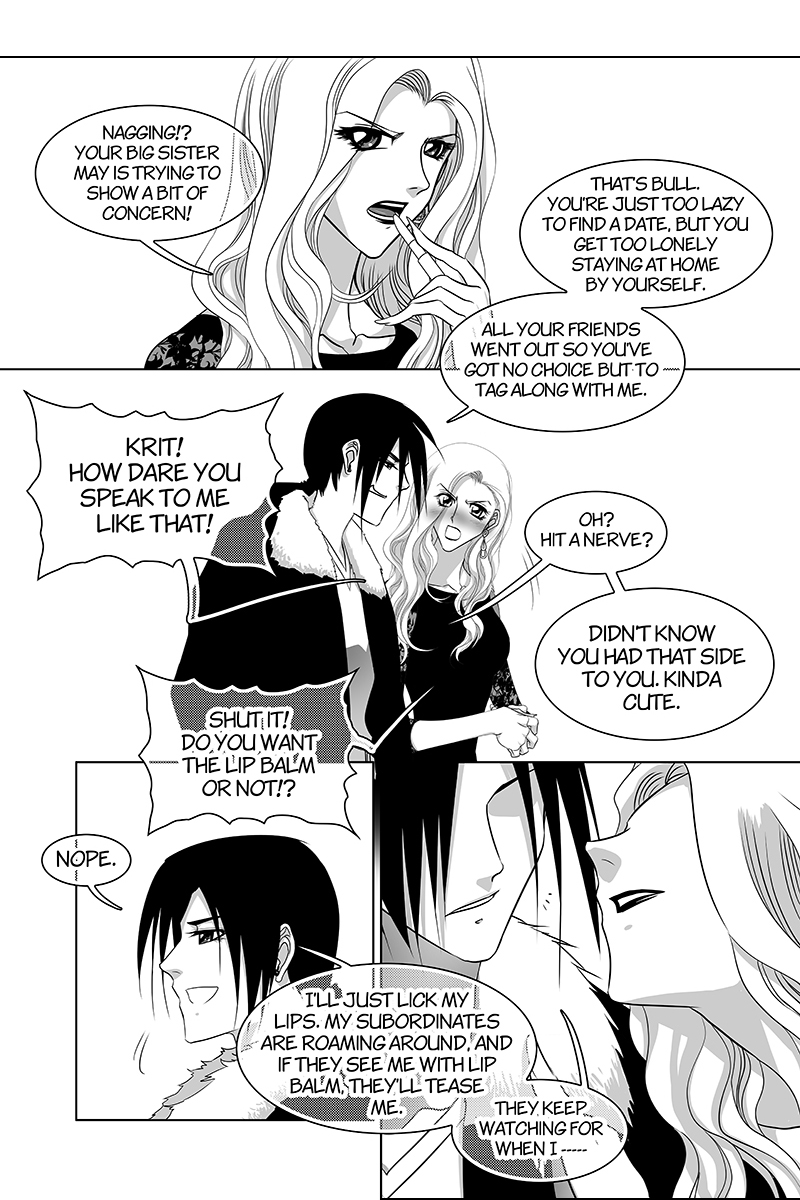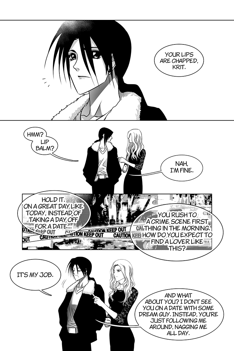 Some of my readers commented that they want to see more of 'Kritiya and Merisa' from Kritiya's series (psychological police story, my first manga serialized in a local publishing house) so I wrote a short story about them here (littleseal said "We cater so much to readers when they sweet talk us if we have a chance we will serve them what they want to see" and I couldn't refuse). When this chapter was published, some readers commented that Kritiya (the black-haired protagonist) looked more feminine than before. I guessed it come from my art skill at that time and her ponytail (in the main series she rocked short hair). Even though these two didn't relate but there's nothing between them other than being siblings (so don't ship them, OK? lol)