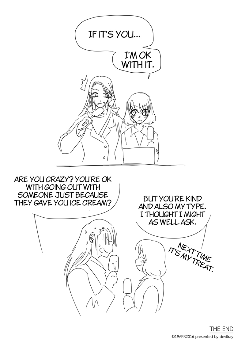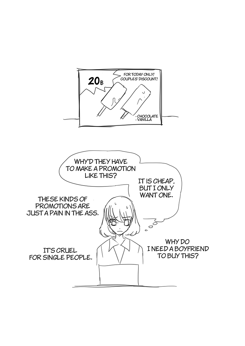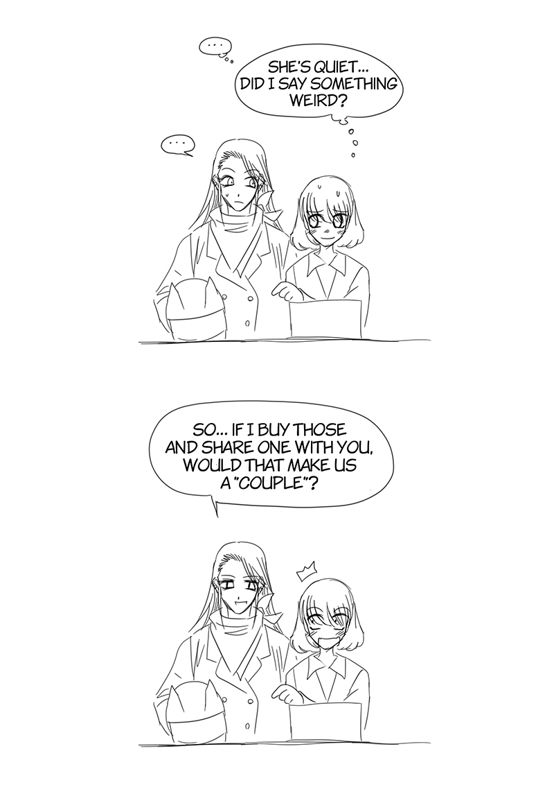 That time we had seen an ice cream promotion in the convenience store. My wife said "Buy-2-get-discount promotion like this, if it's a single person what should they do? If they gonna eat all ice cream by themselves didn't that will cause them a stomach ache?", I got the idea from that, and BOOM! this chapter. I was super busy at that time so I decided to create a raw storyboard and typesetting in it since I was afraid that if I wait until I have time to do it as a complete manuscript the idea will not fresh or I might forget about it and never get it done.