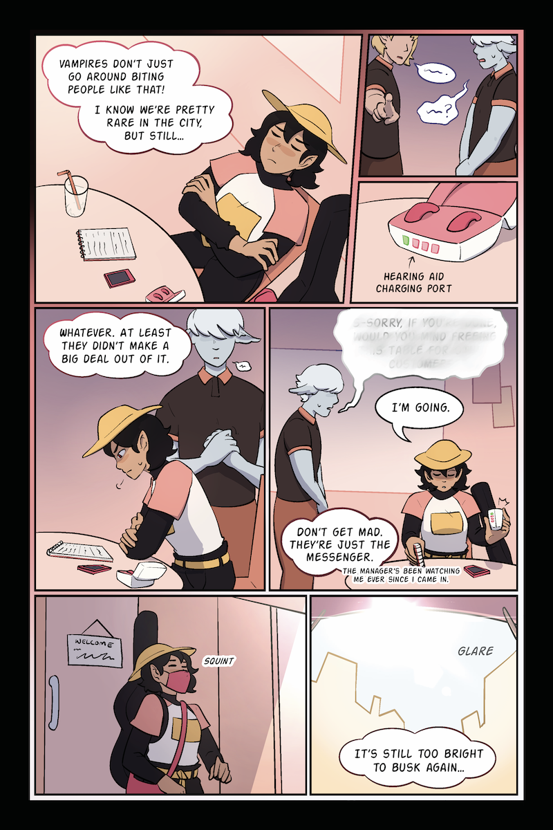 Living as a newly-independent, blood-sober vampire, Hestia just wants to live free, eat good food, play her bass and forget the past. But city life is tough, and after a string of job-rejections, Hestia begins to wonder if she’ll make it alone. That is, until she catches the eye of a café owner in need of a stand in for a live-music night. A new world opens up as Hestia starts working at Café Nocturne, a coffee house for nocturnal spirits.