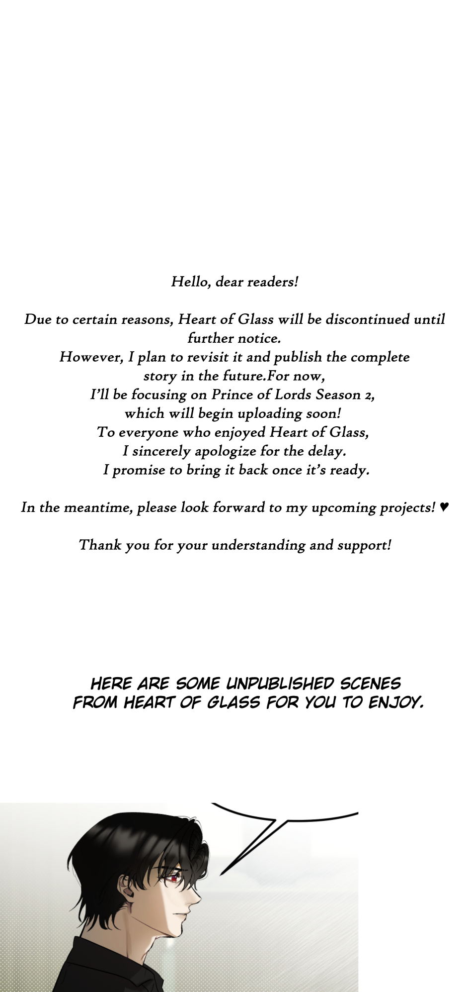 For now, I’ll be focusing on Prince of Lords Season 2, which will begin uploading soon! To everyone who enjoyed Heart of Glass, I sincerely apologize for the delay. I promise to bring it back once it’s ready.