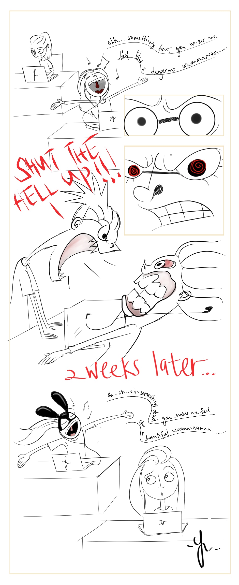 Haha.. To be honest, I'm so fond of Ariana Grande but her songs are..................... prettyyy good though. So here's a strip that actually happens hahaha featuring my cousin, Mishau. She annoys the fuck out of me with that song and out of nowhere, I started whistling the damn song! Damn you Mishau, daaaaaaammmnnn you! Enjoy! Please, don't stone me to death with the "not so fond of Ariana Grande" statement. Ok. Imma go now. Enjoy!
