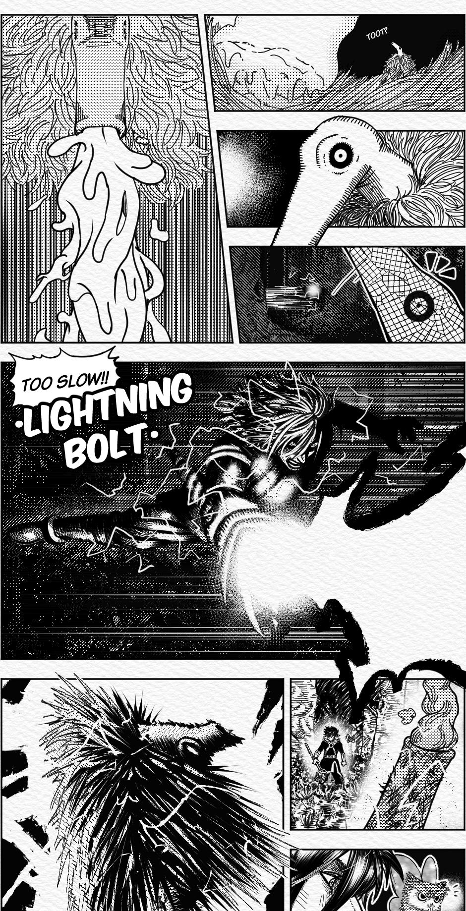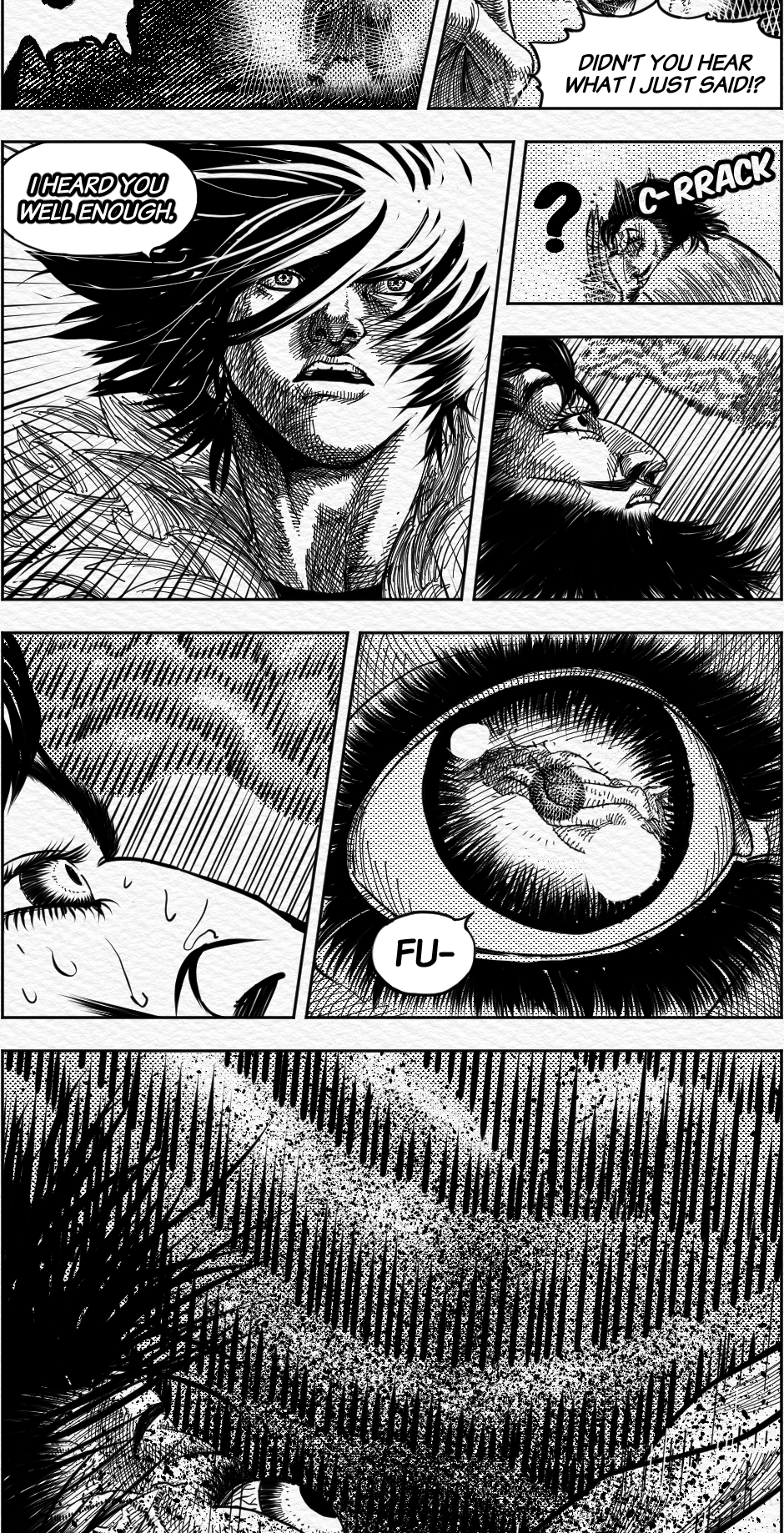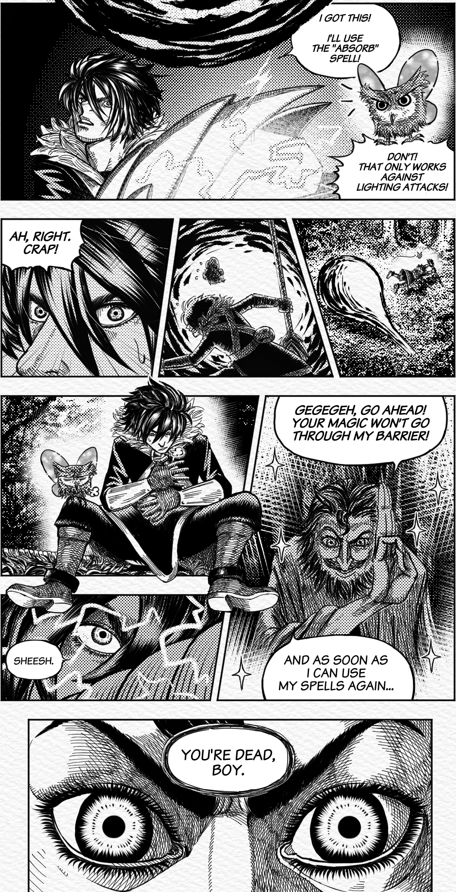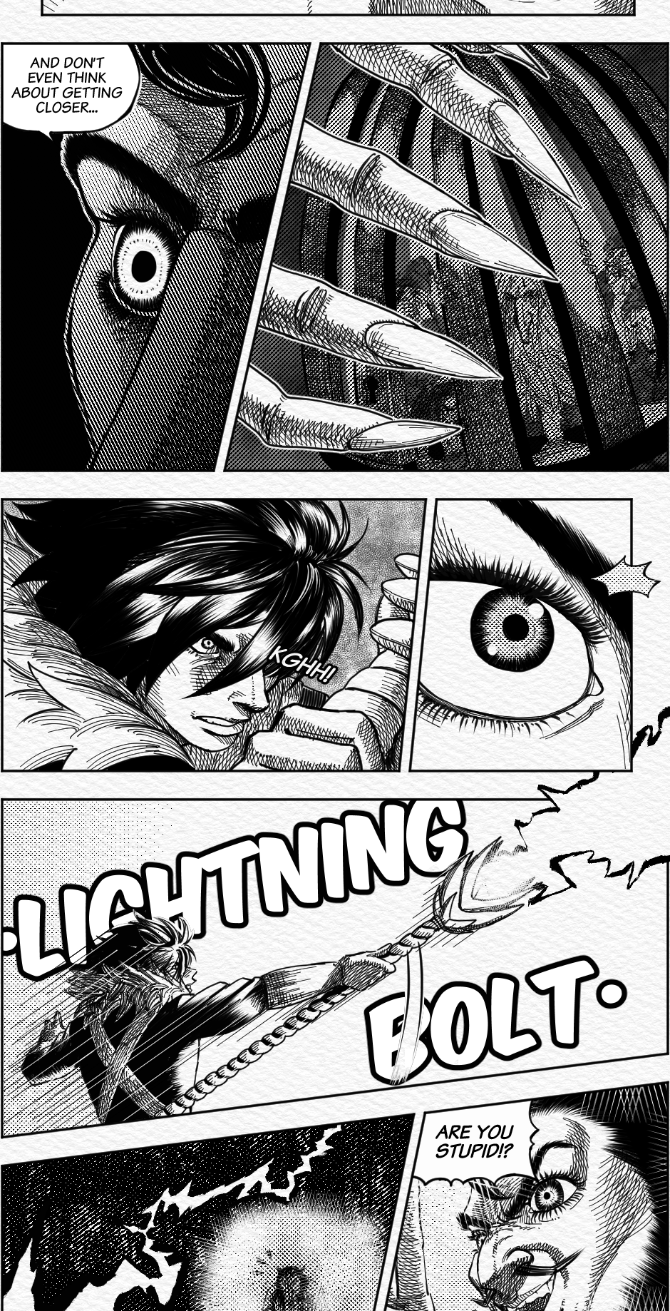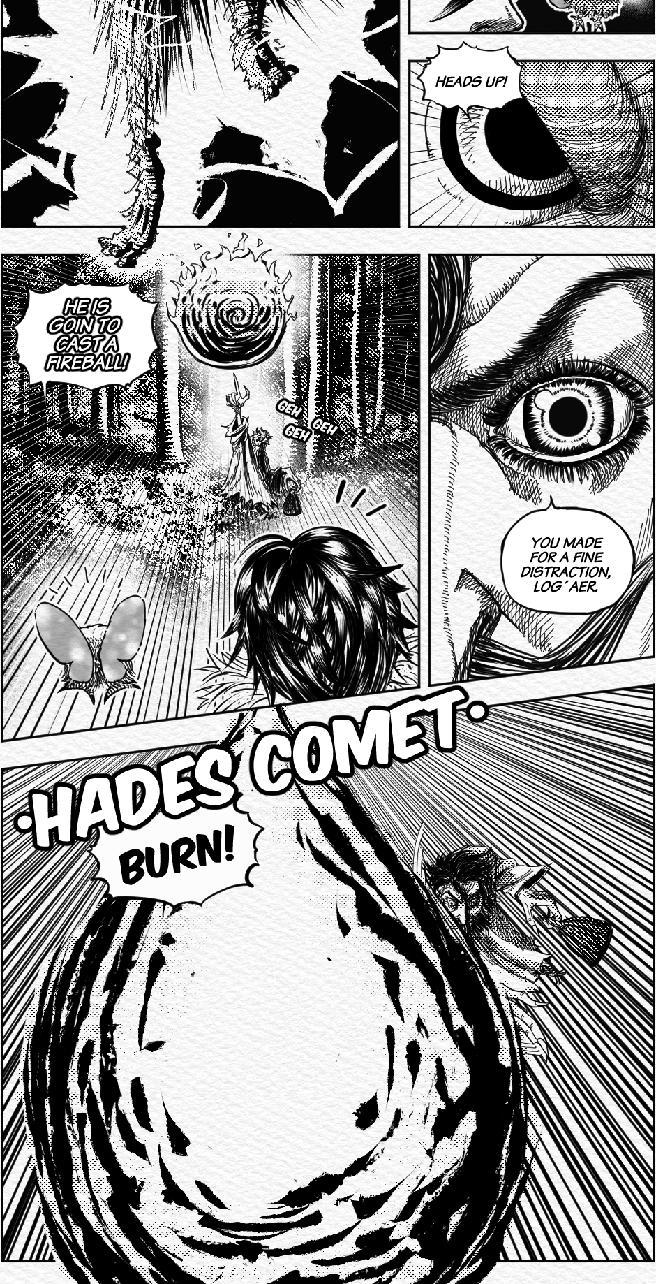 Wonderful cross hatching all in all, but what I'm really curious is how where you able to do that brush like effect on the lightning bolt, the fireball and the magic attacks, did you use a specific brush?