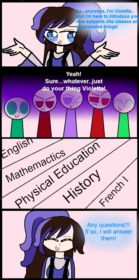 They were still not kind of friendly or didn't get to know Violetta better or that well. ^^" Well..she took like 10-13 minutes of the tour. Yelp! So..Violetta is done with that..now shes waiting for the "New Students" to ask her questions. The next page is still her though. XD