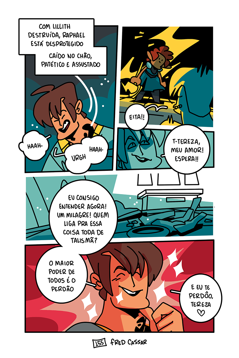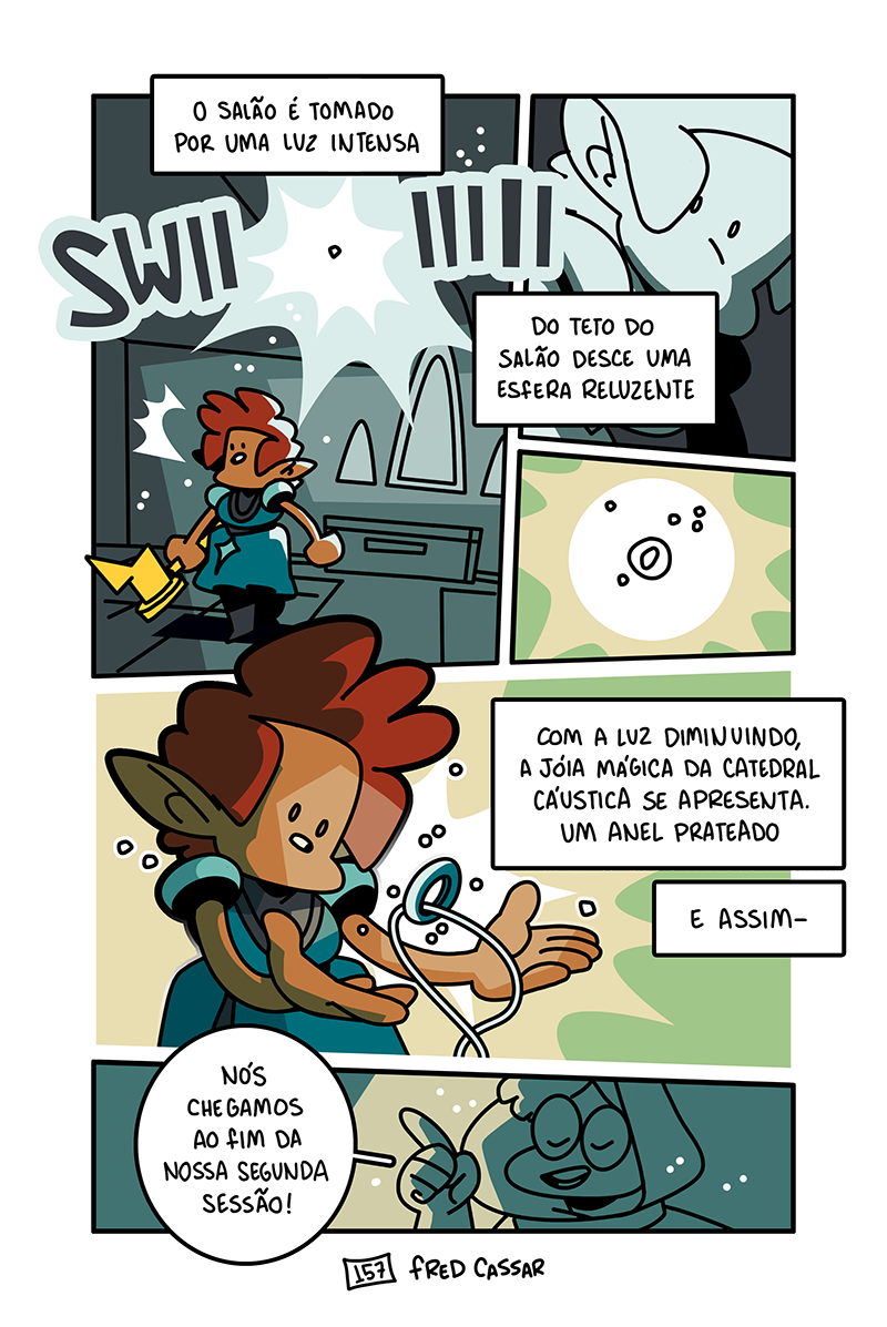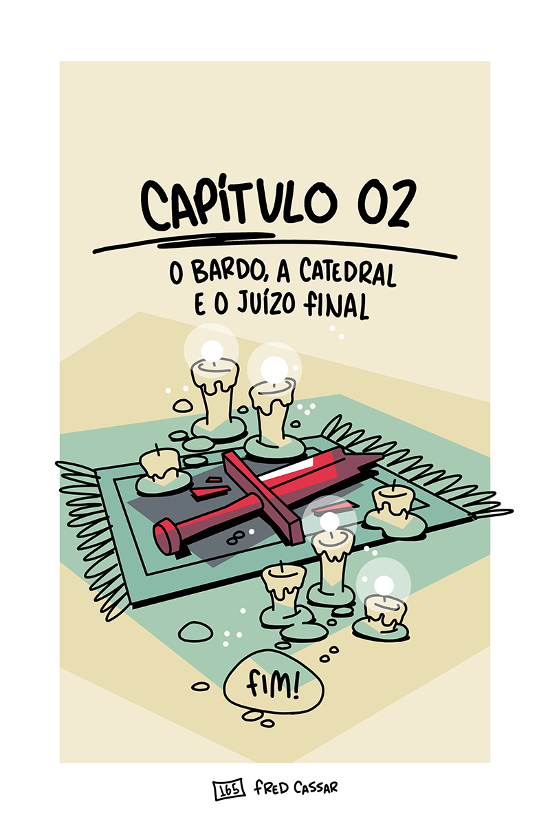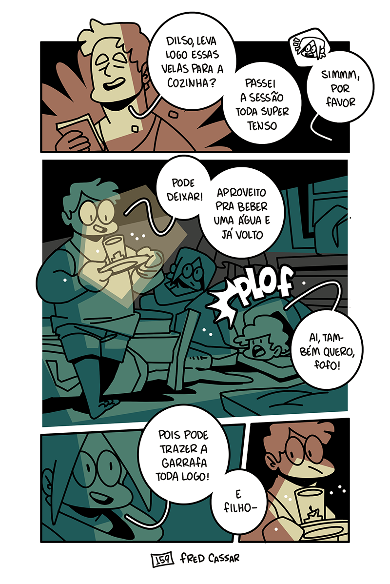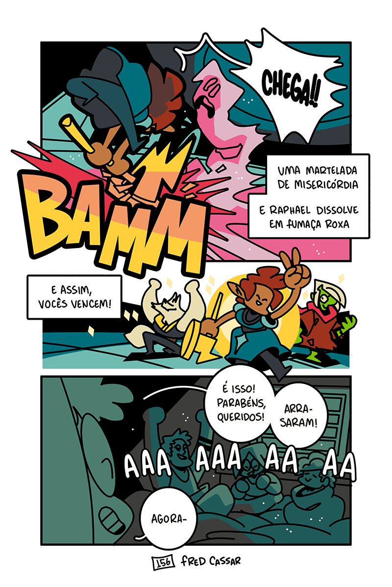 Finalmente, o final da nossa segunda sessão. Depois de um turno final espetacular e com Irmão Raphael devidamente derrotado, os aventureiros comemoram e Edilson pela primeira vez sente que está fazendo um bom trabalho. Ele até consegue escapar do quarto com nada mais que um puxão de orelha da mãe, olha só. Mas é isso, fim do capítulo dois. O que acharam? Por favor me falem o que acharam. Espero que tenham curtido e, se quiserem ajudar o projeto, indiquem Espadaprisma pra quem acharem que curtiria o quadrinho!