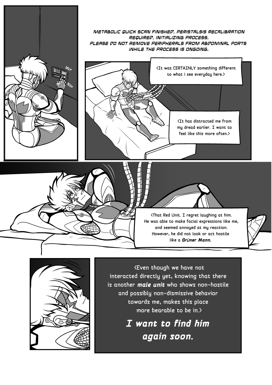 Crisanto is a cyborg soldier created to defend a newly stablished off-world colony. However, more than battles he yearns of companionship, concept that in his world is not embraced. Then he meets Brant, a cyborg who has just arrived from a scouting mission on Earth, and recently got transferred to the same base he is in. They get to know each other and their relationship develops.